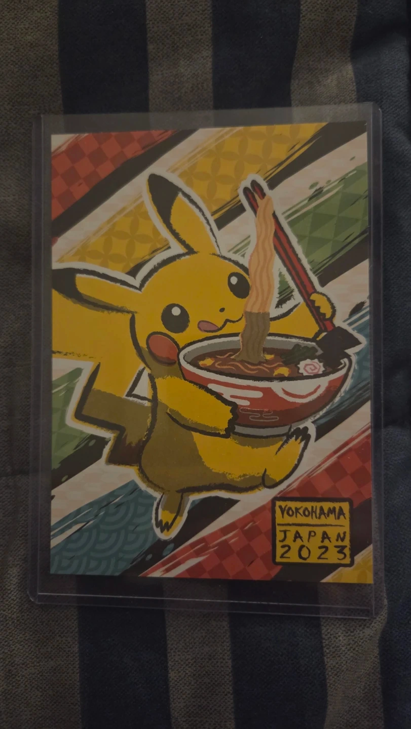 Official postcard from the Pokemon World Championships in Yokohama, Japan, 2023. It features Pikachu enjoying a bowl of ramen. A must-have for any Pokemon collector!