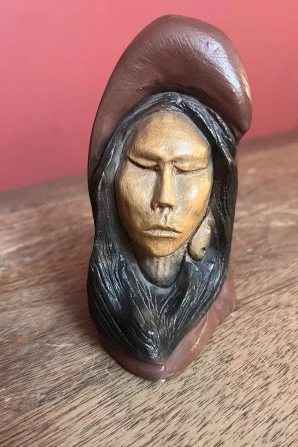 Carved wooden art piece titled "Memories" by Thomas Maracle. This expressive carving depicts a woman with her eyes closed, adorned in a hood. Its unique artistry would be a thoughtful addition to any decor.