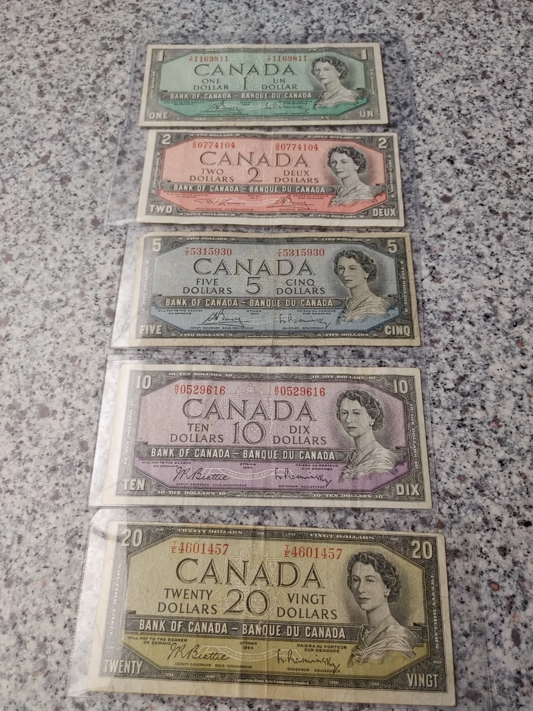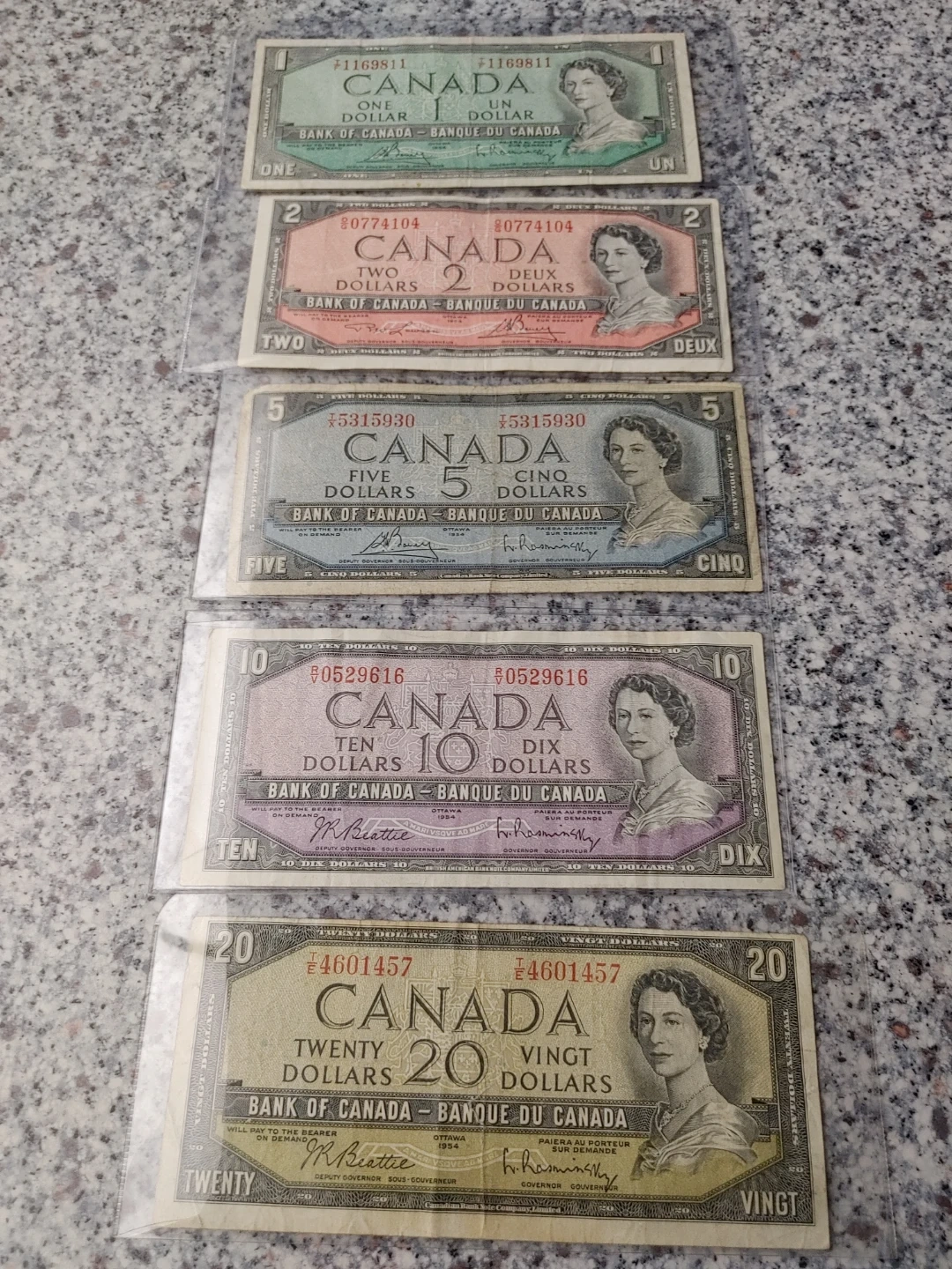 Selling a set of vintage Canadian bank notes. Includes a one dollar, two dollar, five dollar, ten dollar, and twenty dollar bill. Great for collectors!