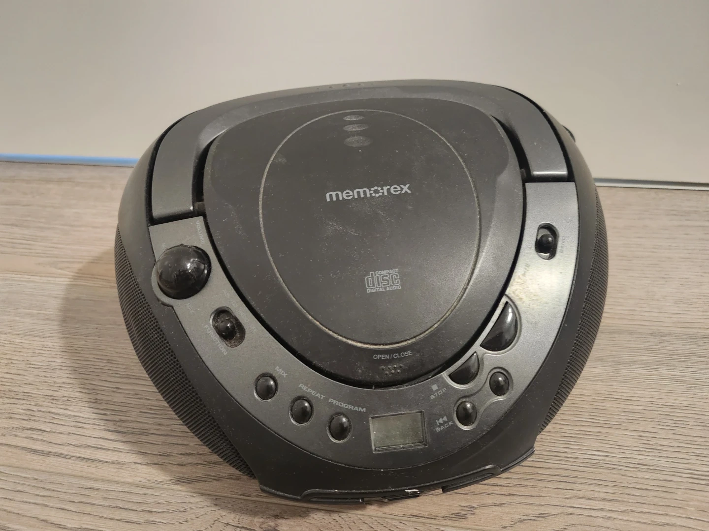 This is a Memorex portable CD player boombox. It's black and has a digital display. It plays CDs.
