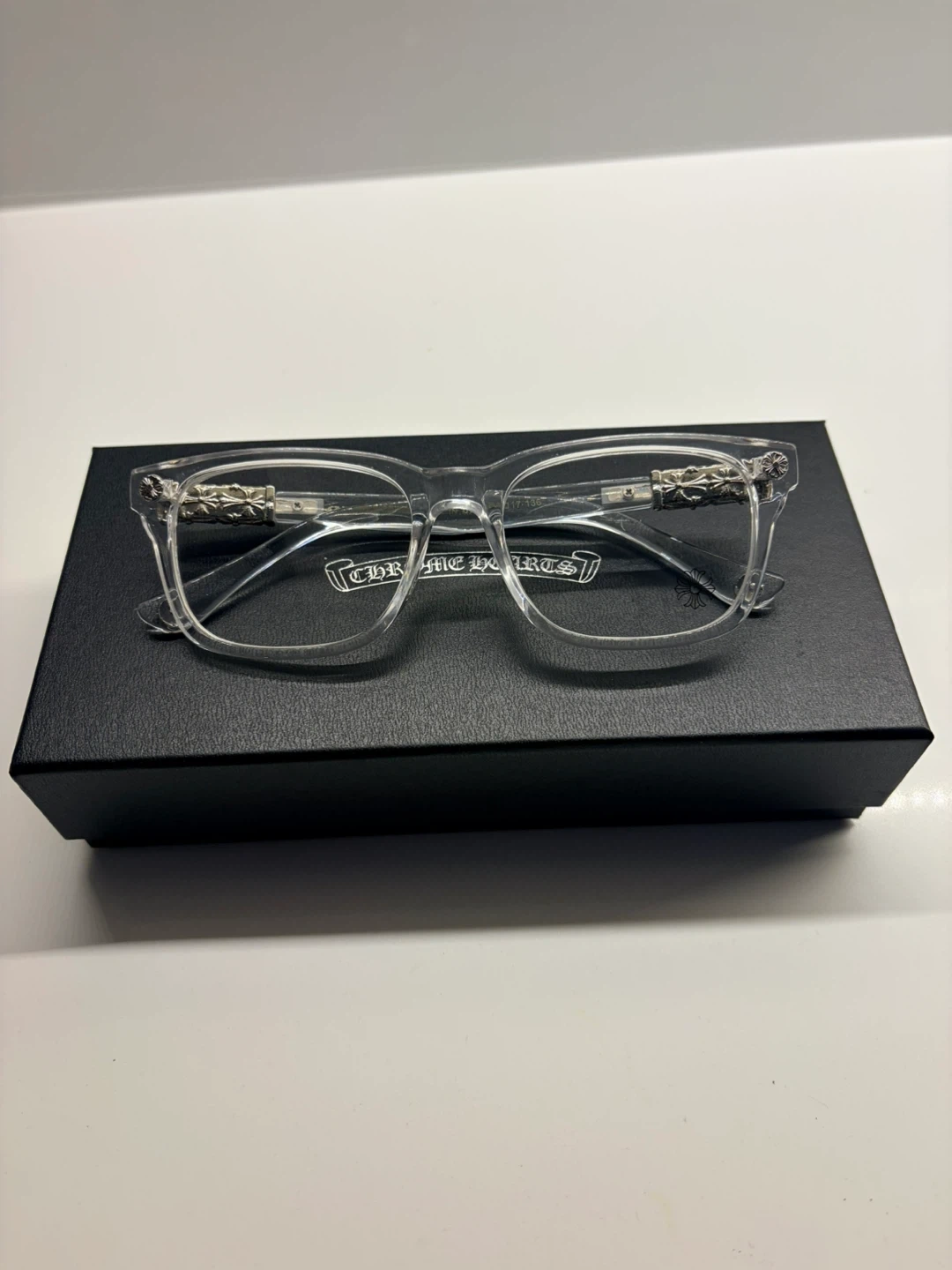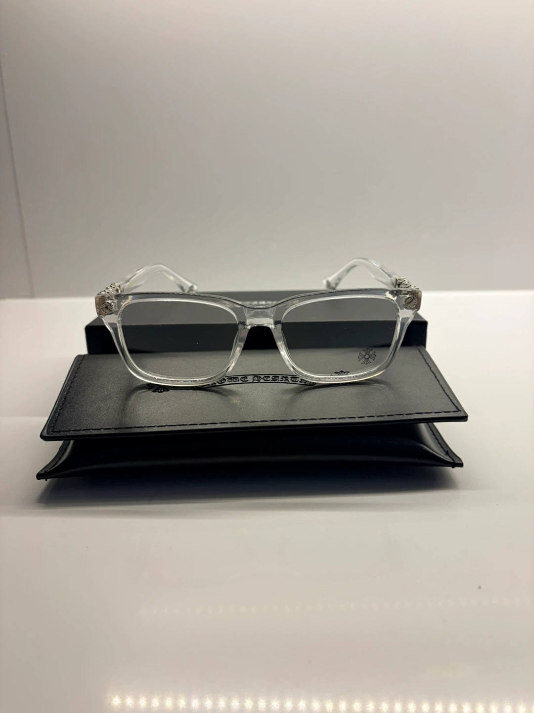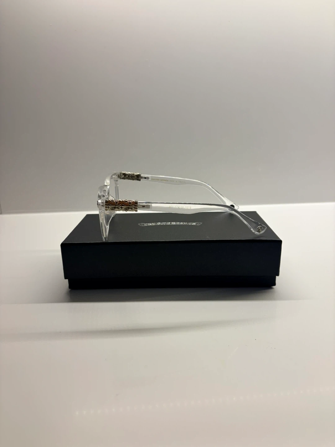 Clear frame glasses with silver accents on the temples. Includes original box and case. These are statement eyewear pieces.