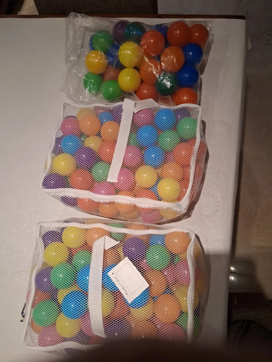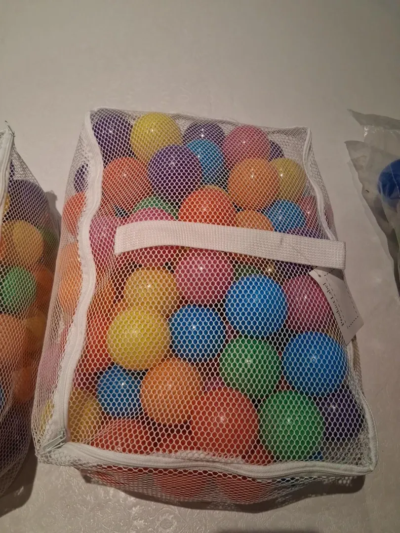 Soft Pit Balls, Chemical-Free Crush Proof Plastic Ocean Ball, BPA Free with No Smell, Safe for Toddler Ball Pit/Kiddie Pool/Indoor Baby Playpen. 2 mesh bags of 100 ball per bag $25.00. 1 plastic bag of 30 balls $10.