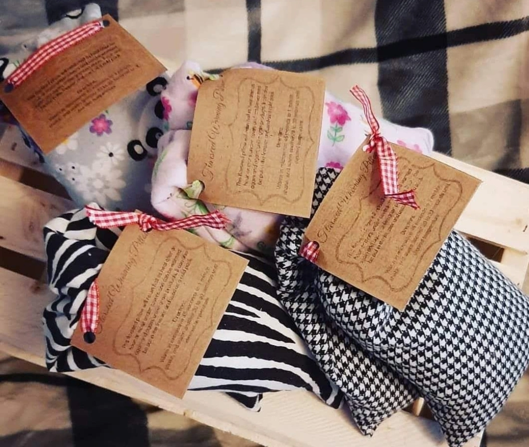 For freezer or microwave. only heat for 30 seconds at a time until desired warmth, for safety. Calming. Lovely weighted feeling. Infused with lavender. Can be unscented on request*