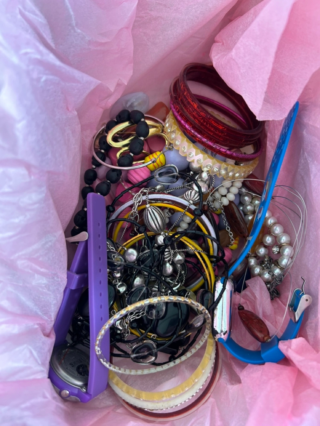 Free! Fun collection of assorted jewellery. Includes various bangles, bracelets, necklaces, and a kids watches. None valuable, just fun! Many colours and styles. Perfect for crafting or personal use.