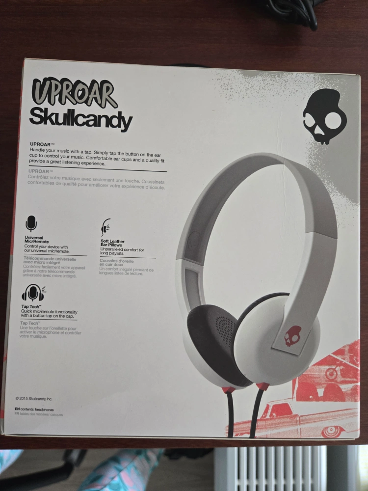 White Skullcandy wired Uproar headphones in box.Features a universal mic remote. Soft leather earcups. Tap Tech functionality.