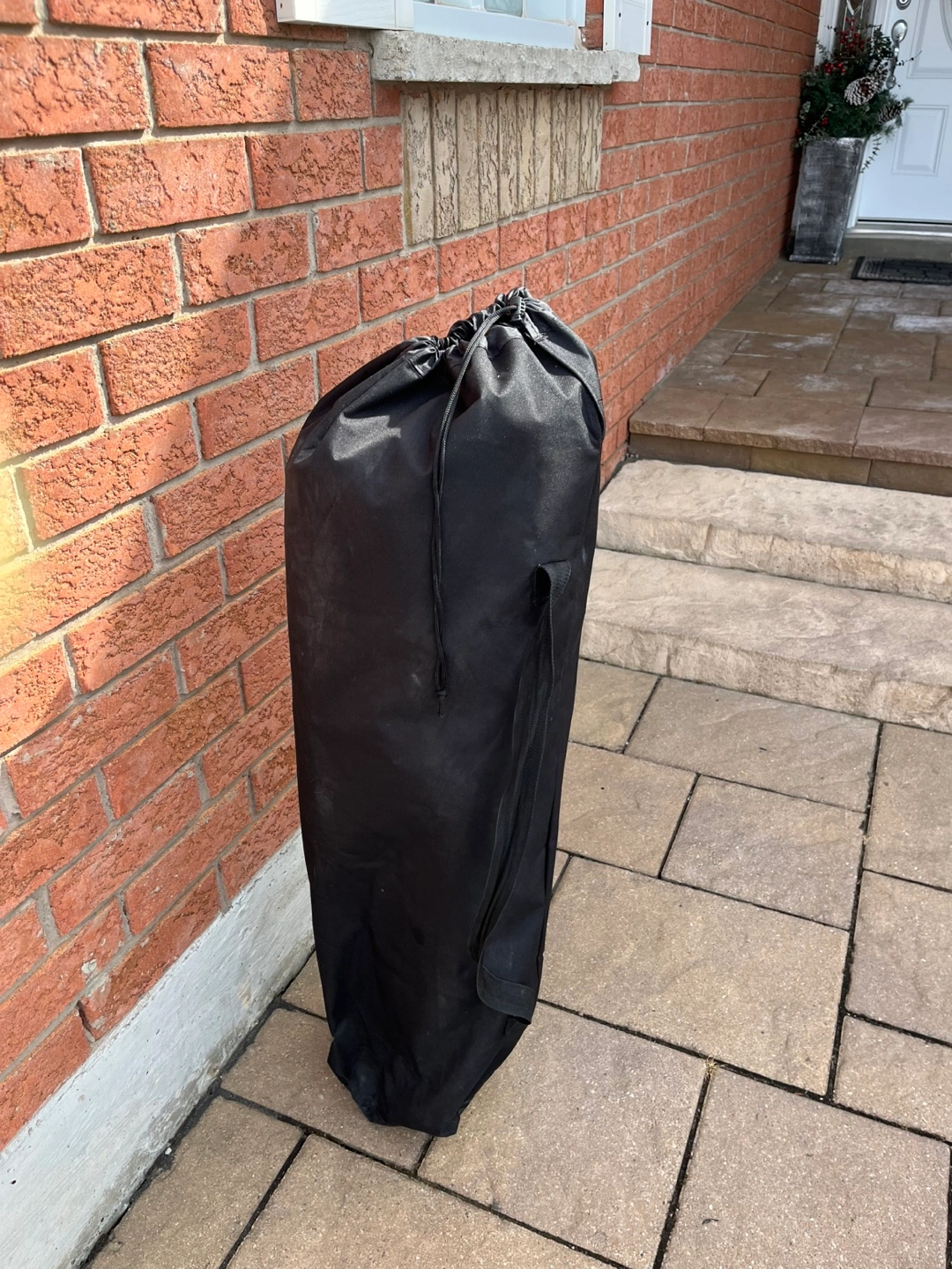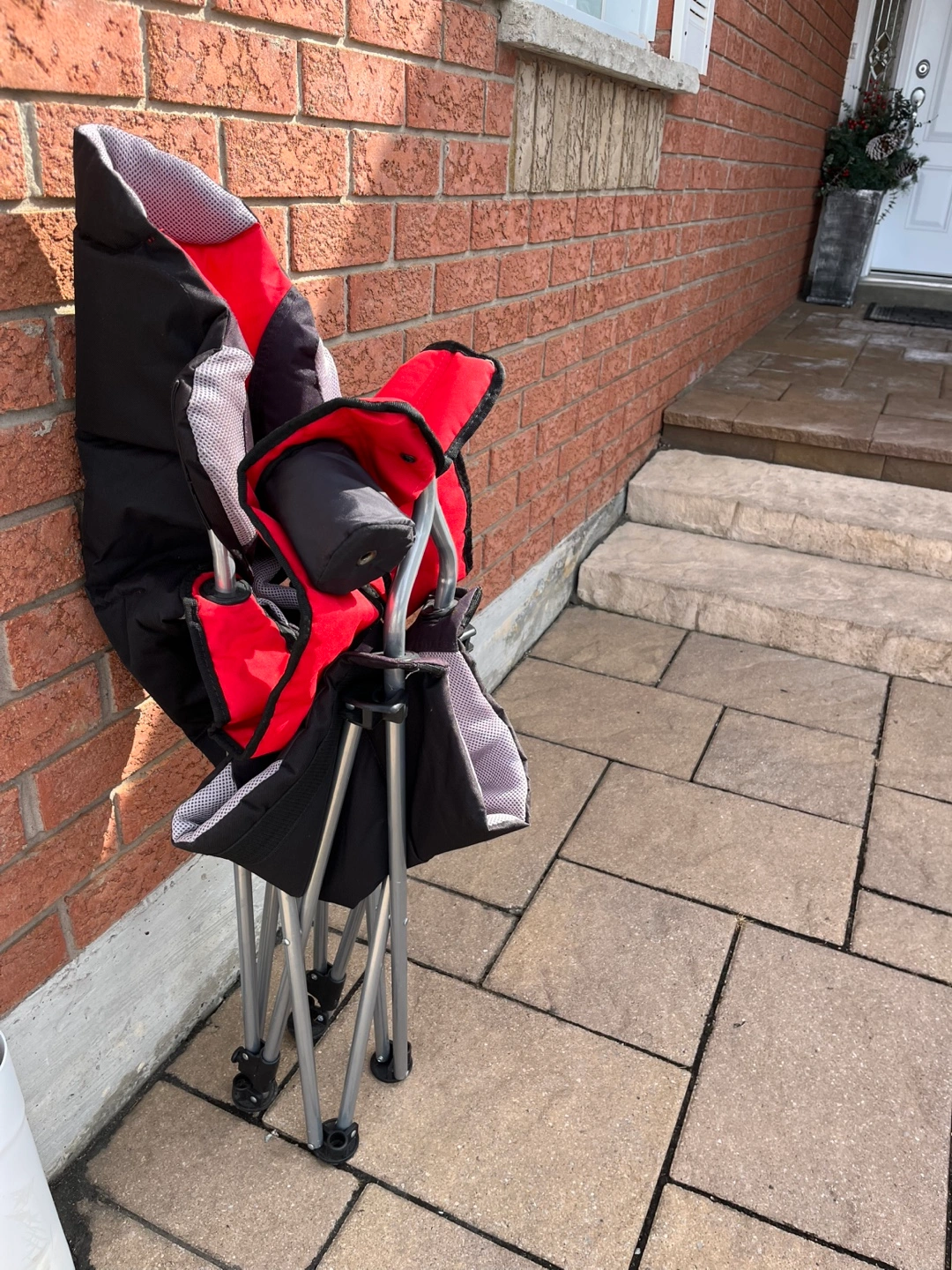 Red and black folding chair. Lightweight and portable. Includes carrying bag. Great for camping, sporting events, or relaxing outdoors. Armrests and cup holder.spotless