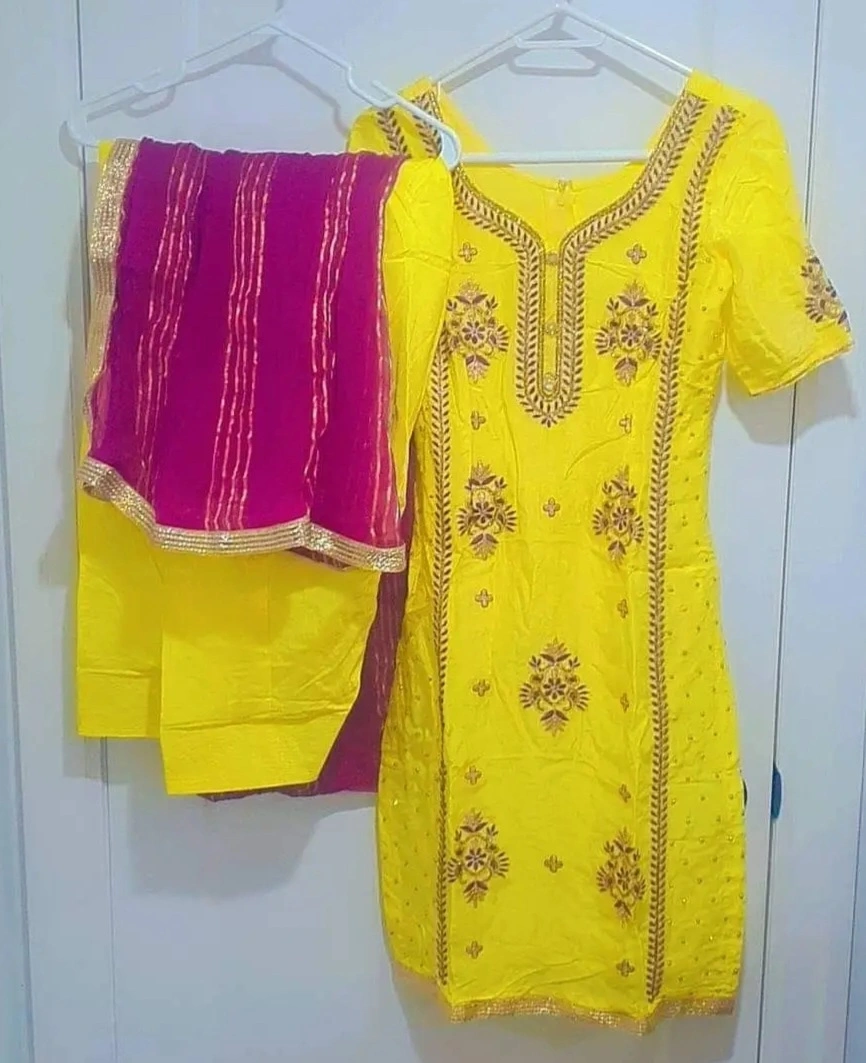 Gorgeous yellow salwar kameez. Intricate embroidery. Matching bottom and maroon dupatta. Ready to wear.