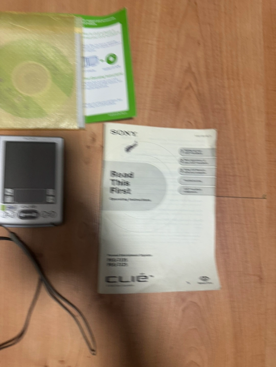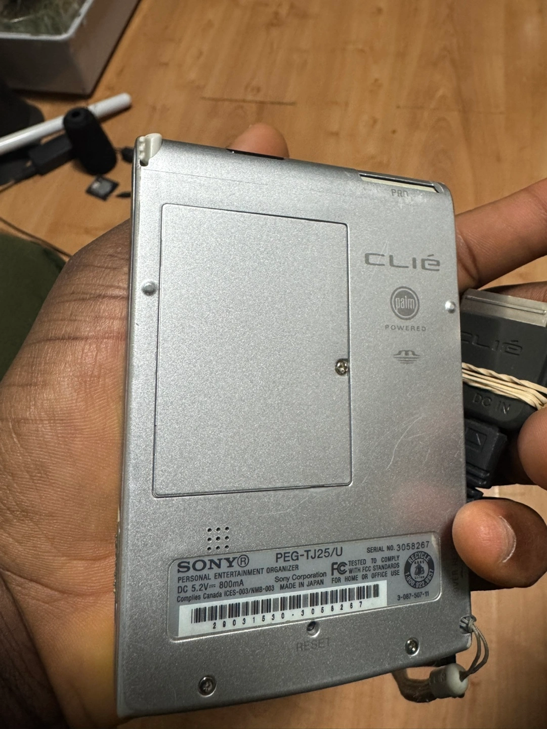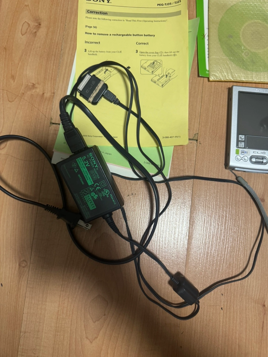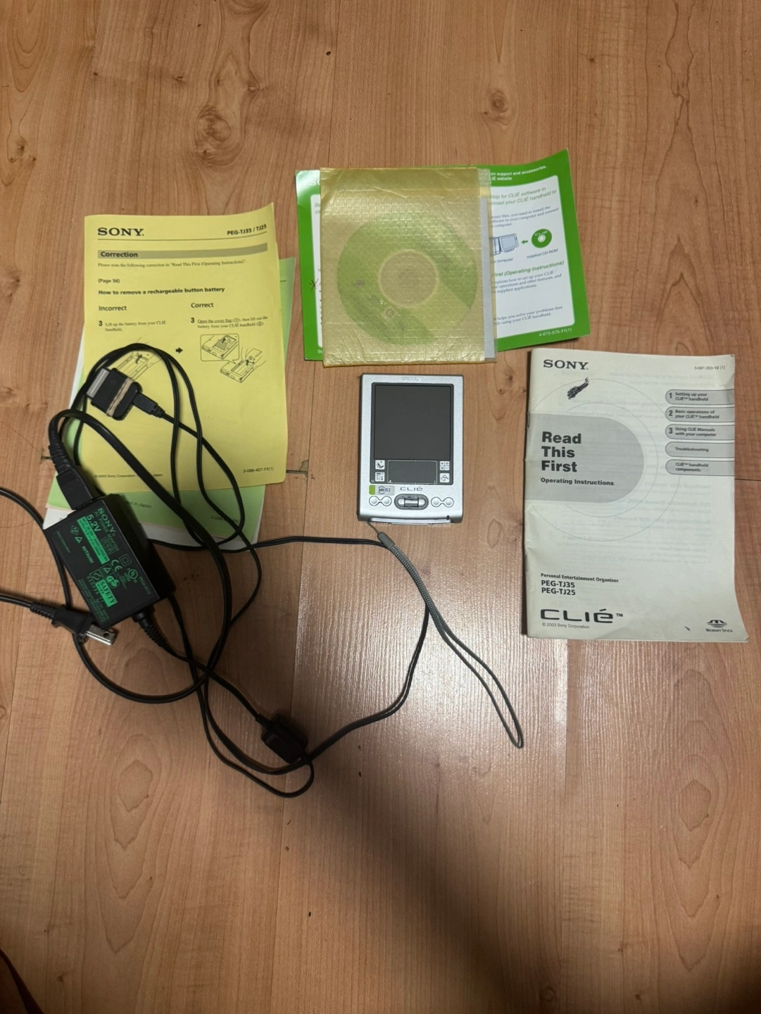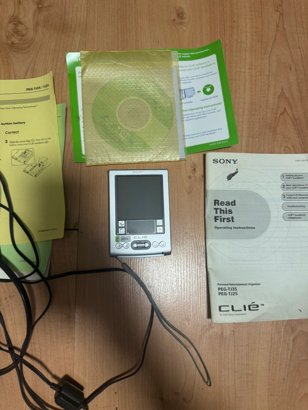 Vintage Sony Clié PEG-TJ35 handheld organiser. Includes charger, cables, and original manuals. Palm OS 5. Great for collectors.