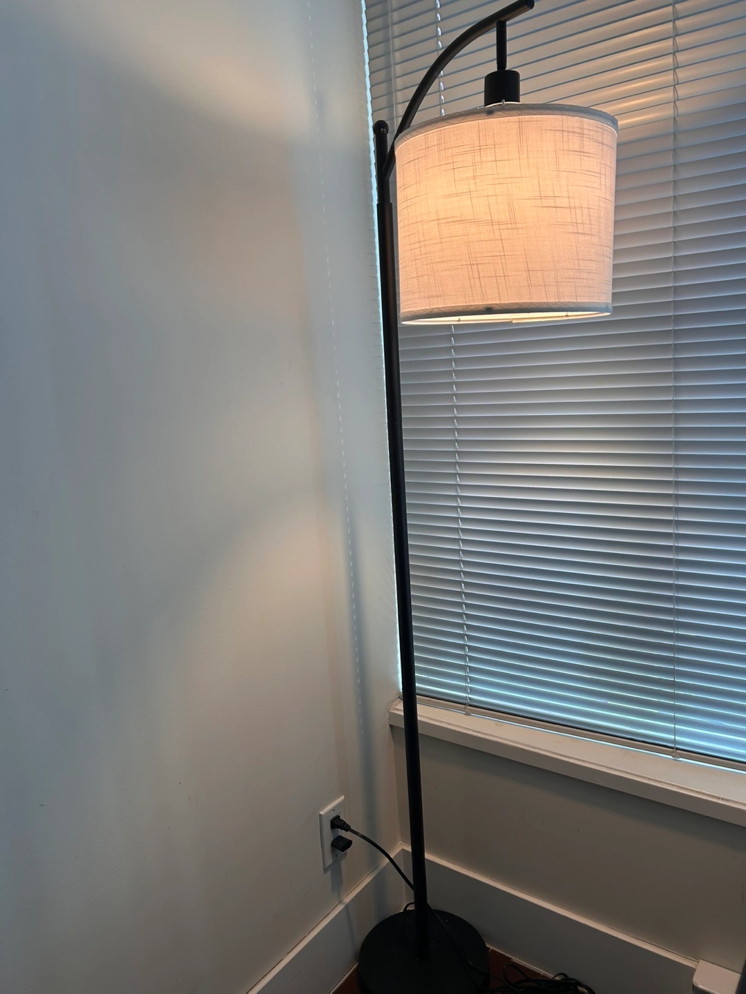 Modern arc floor lamp. Black metal frame. Linen fabric shade. Great for living room or bedroom.