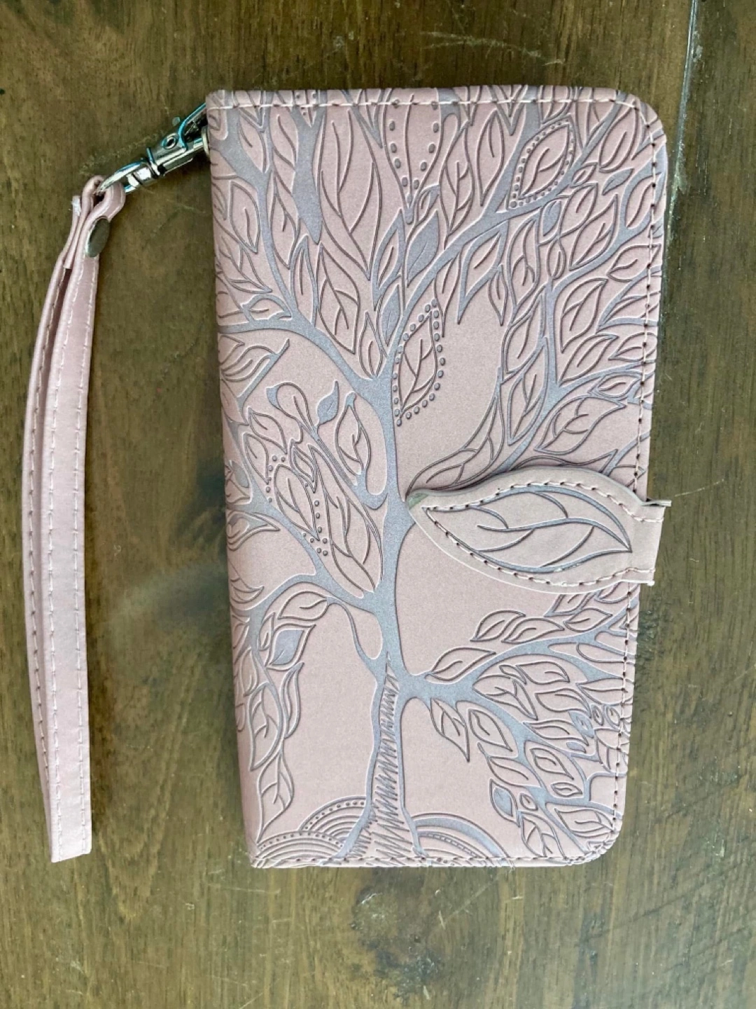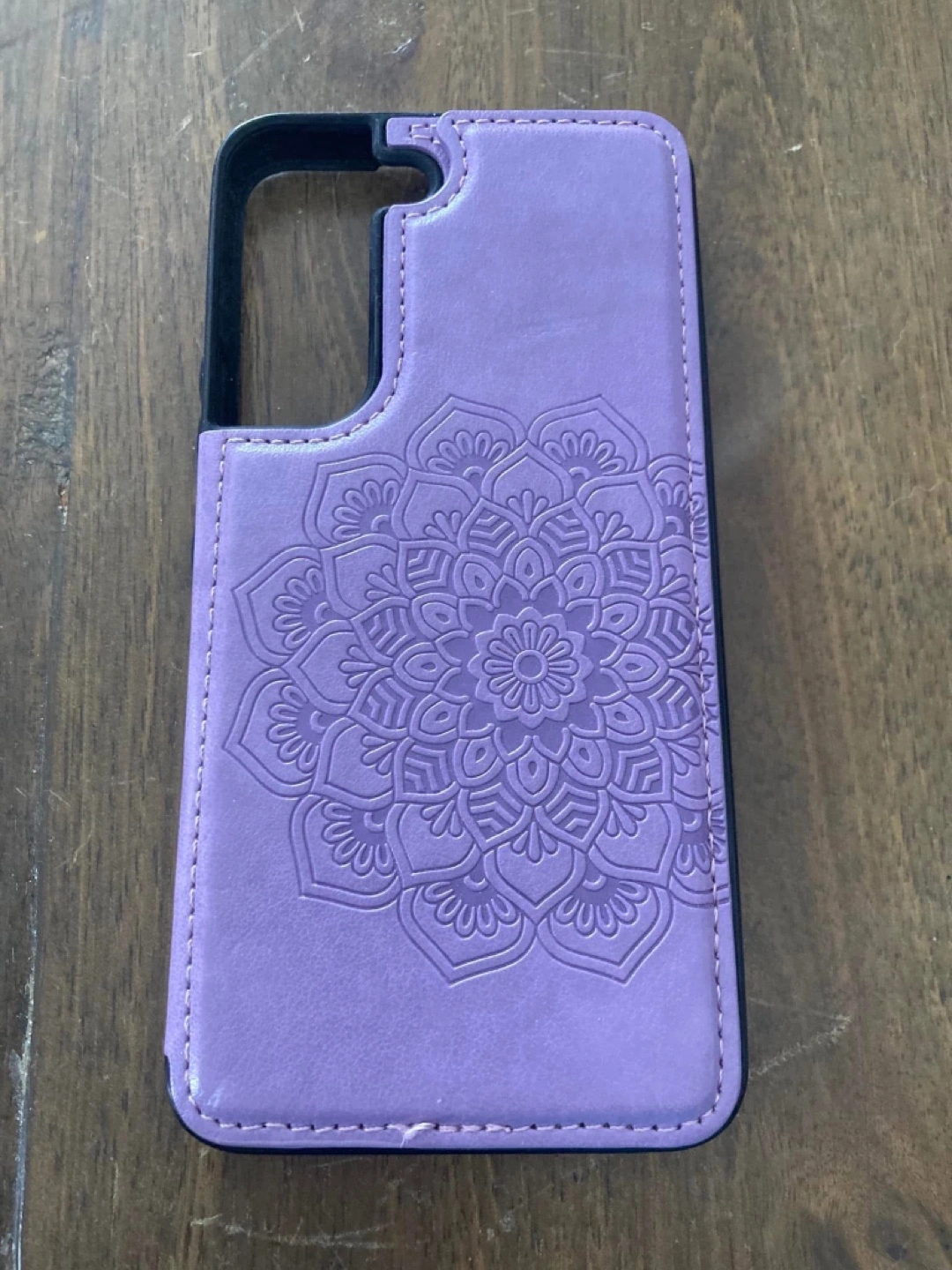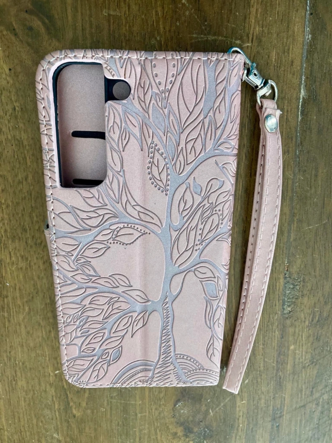 Two stylish phone wallet cases. One features a pink tree of life design, the other a purple mandala. Both include card slots and wrist straps. Compatible with Samsung Galaxy S20.