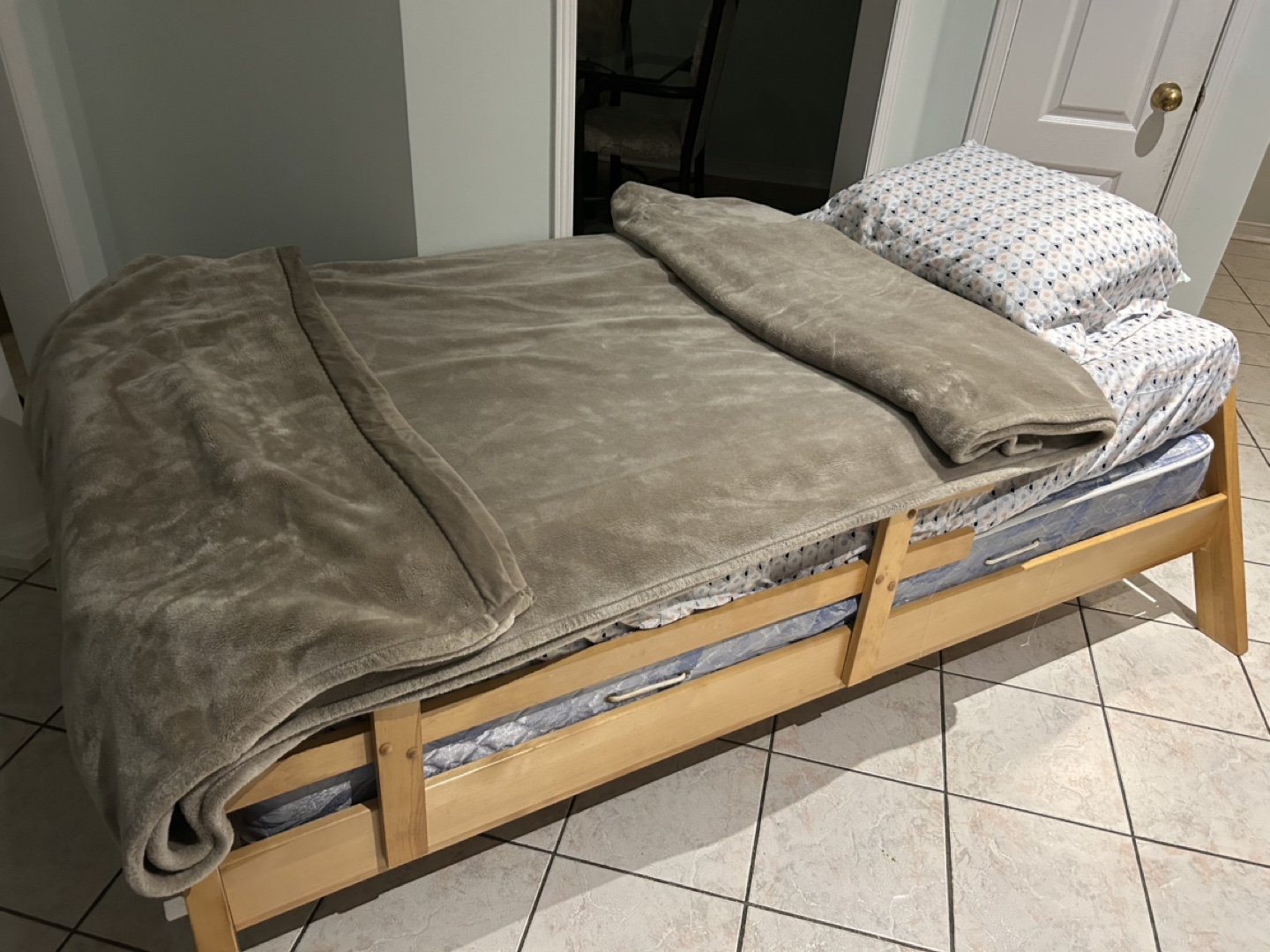Two used desks, one curved and one rectangular. Both in good used condition. One dark brown, one light brown. Also, a wooden bed frame with storage drawers. Great for a child's room.