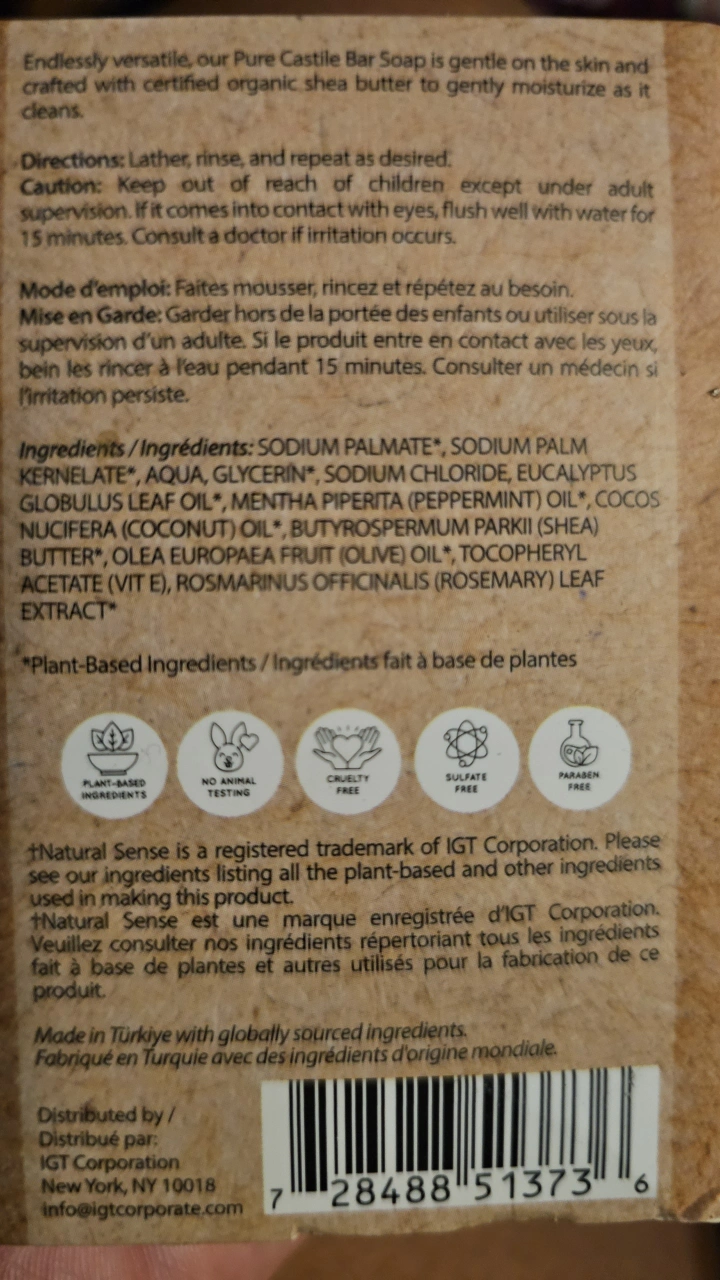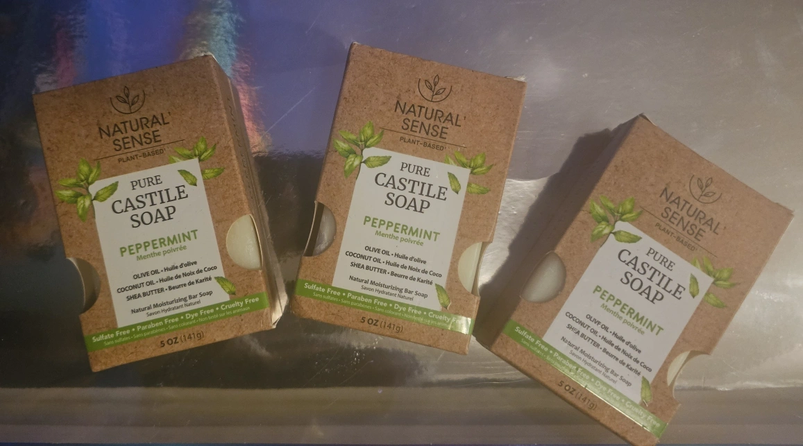 Three bars of Natural Sense Pure Castile Soap. Peppermint scent. Plant-based and sulfate-free. 5 oz each. $2 take all. #thriftypick