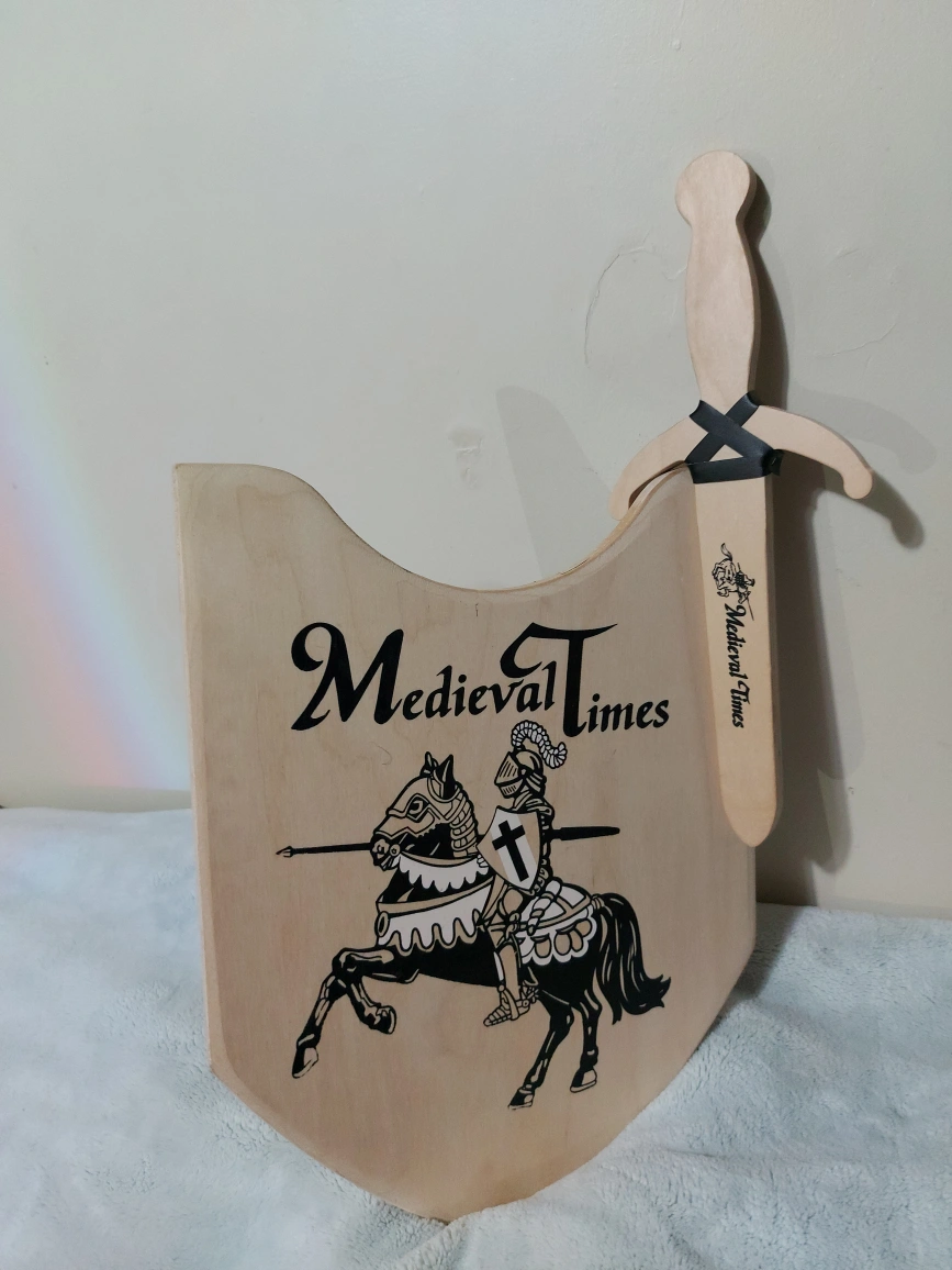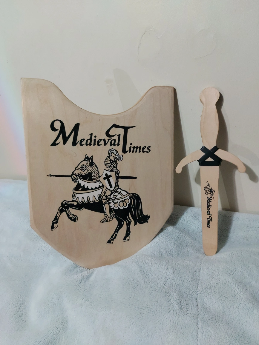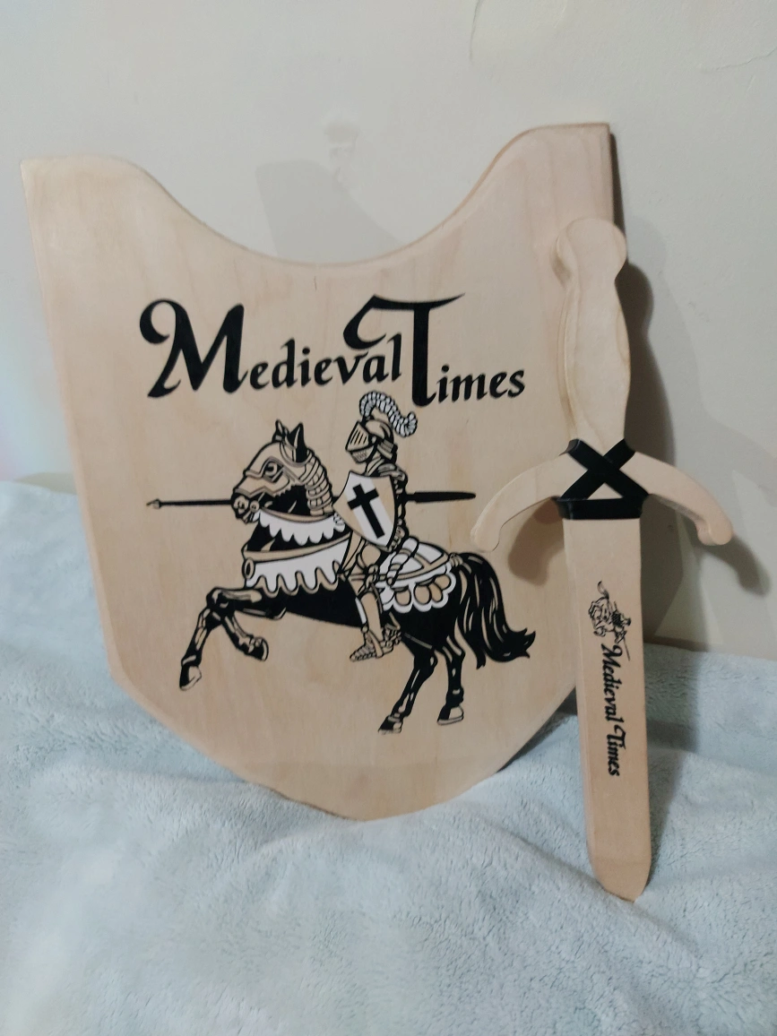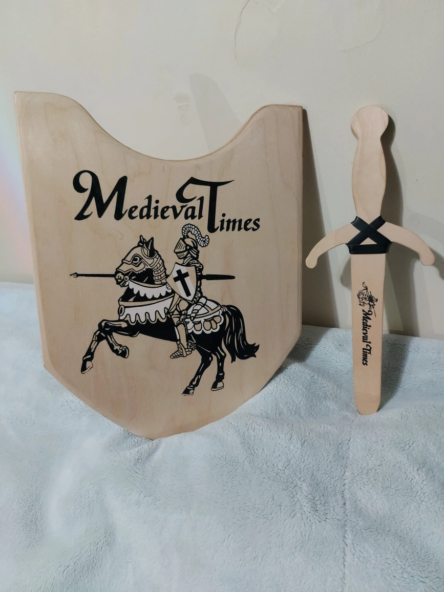10Wooden toy sword and shield set. Features a knight on horseback graphic. Excellent for imaginative play. Great for children.