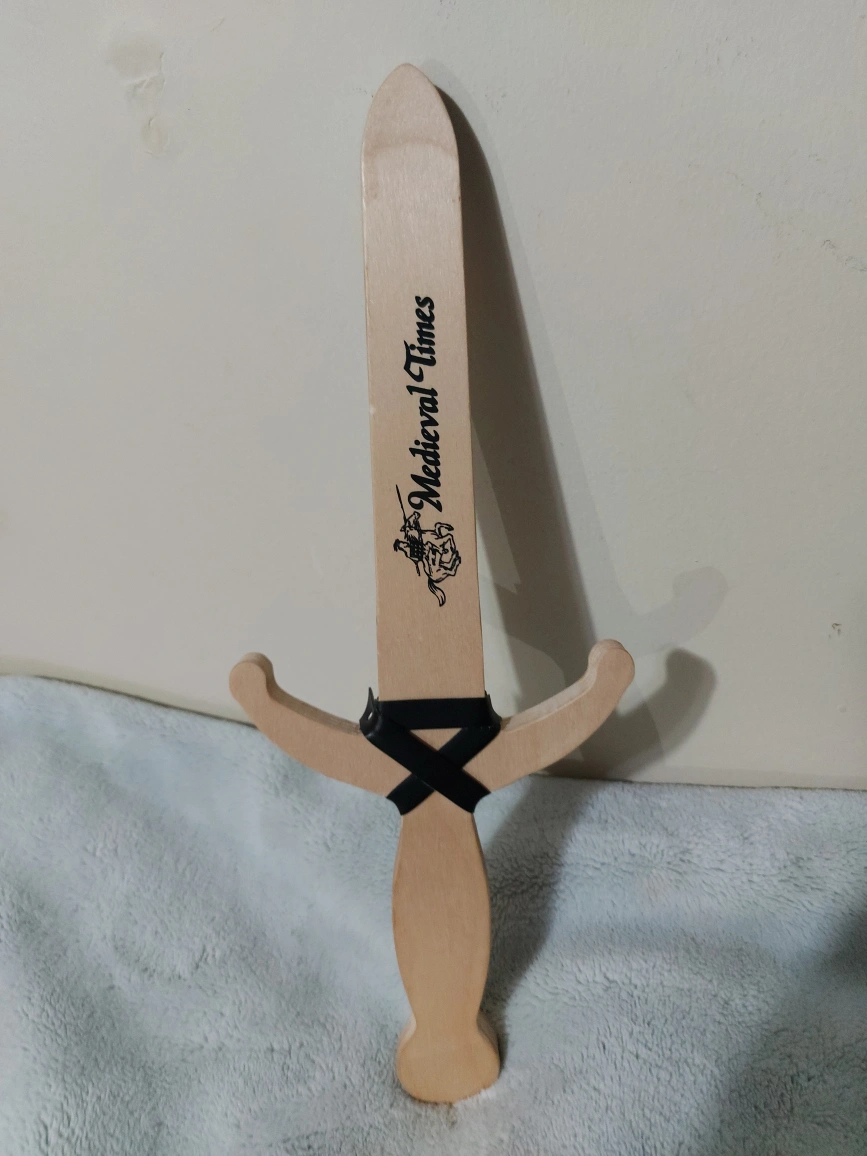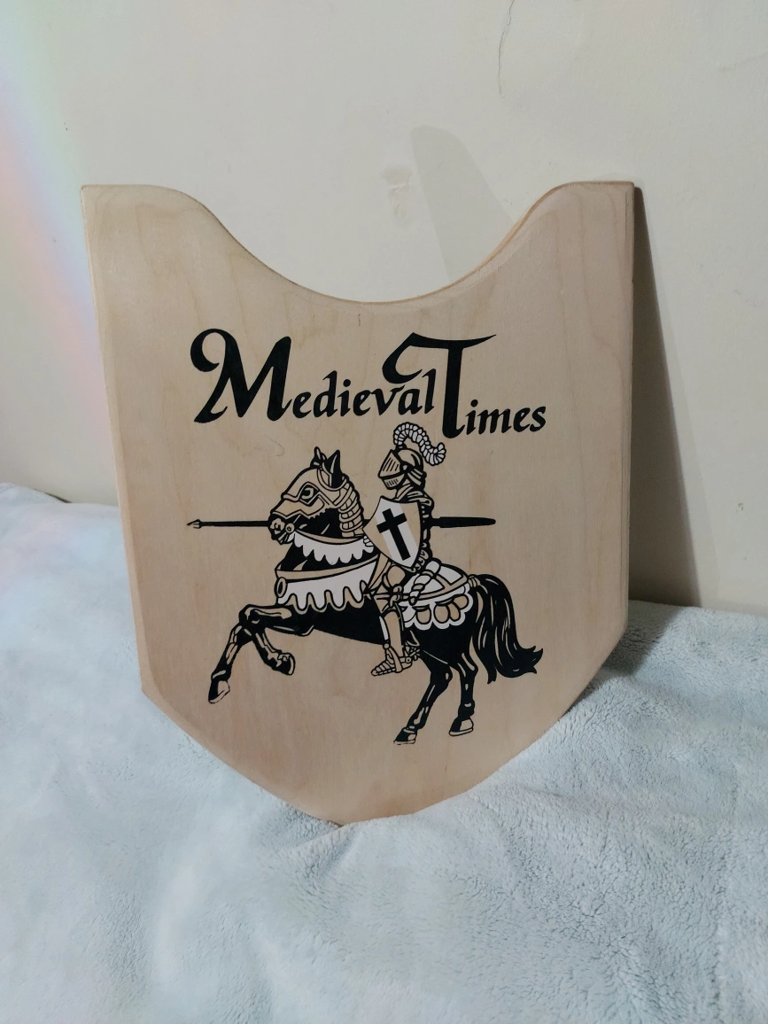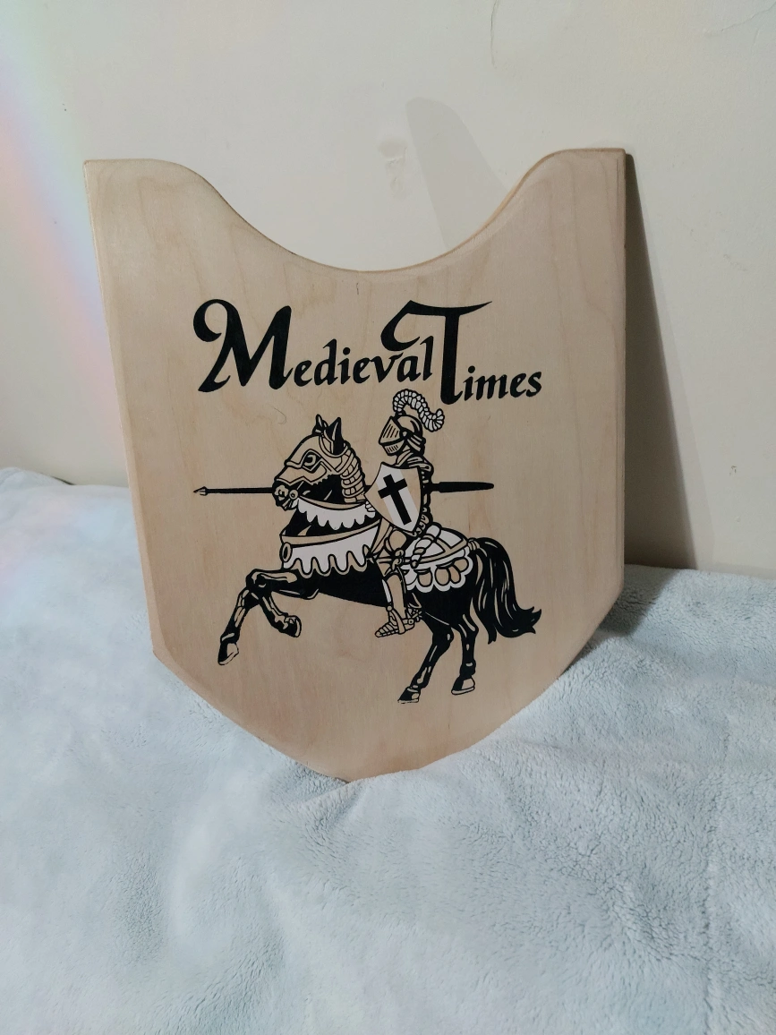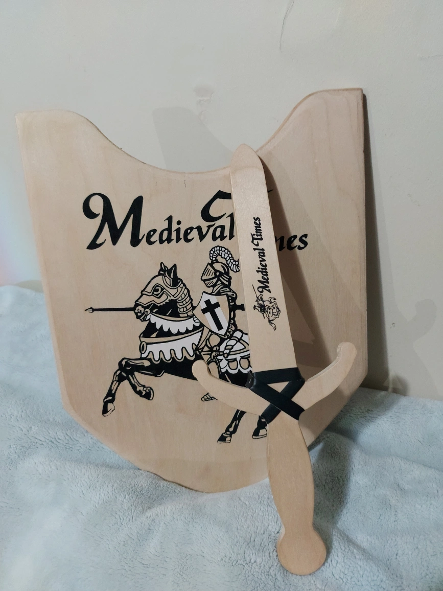 10Wooden toy sword and shield set. Features a knight on horseback graphic. Excellent for imaginative play. Great for children.