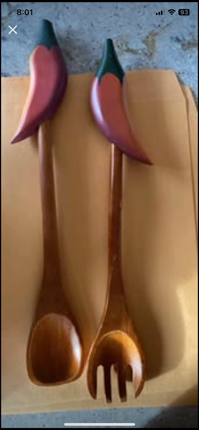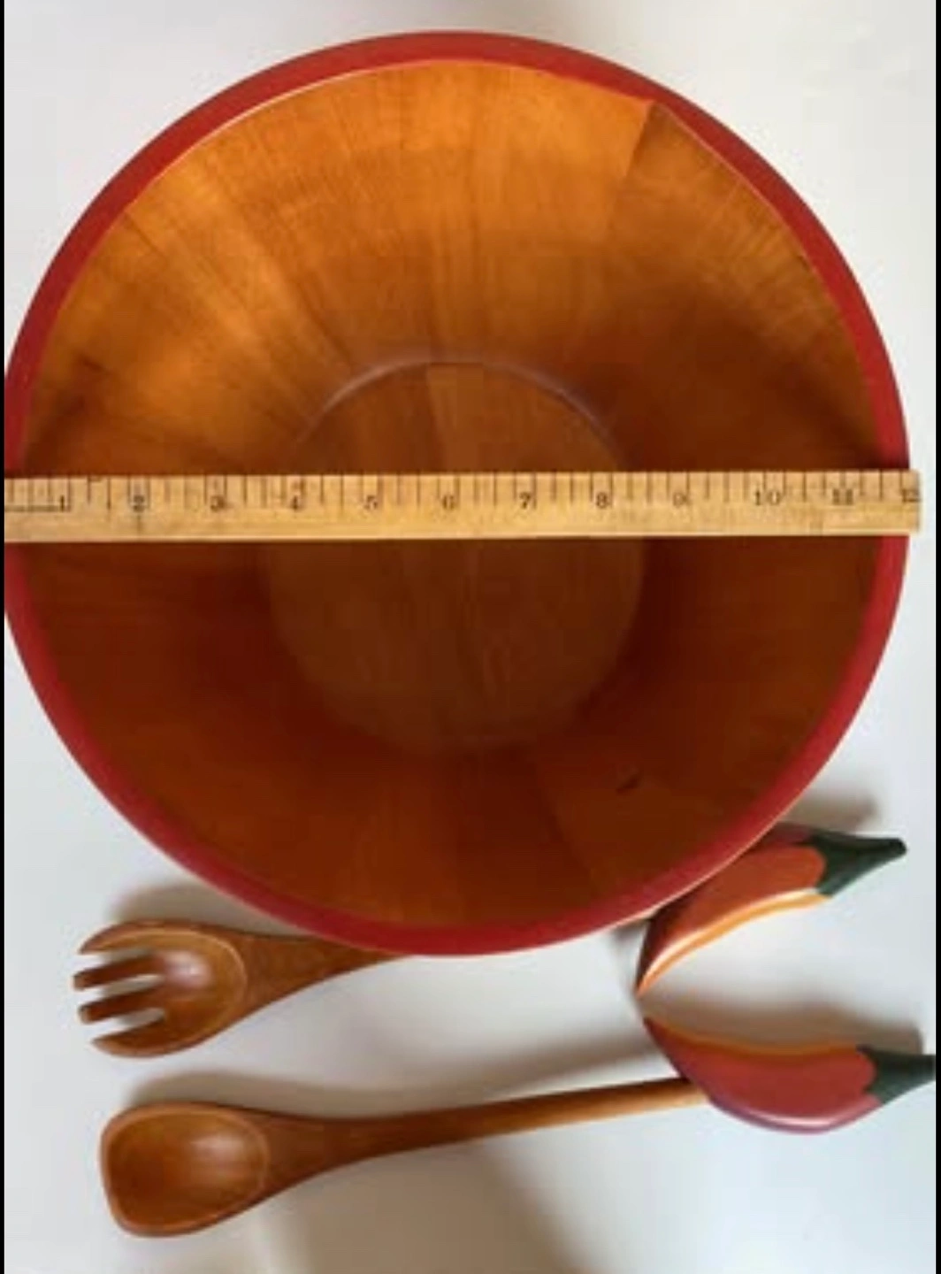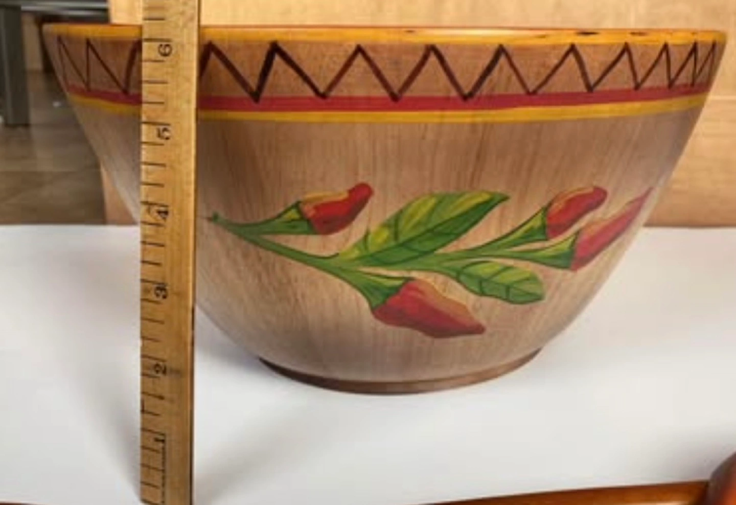 Crafted by clayart. Wooden salad bowl and serving set. Features hand-painted chili peppers. Large bowl, spoon and fork. Unique design, great for entertaining. Pick up in Scenic Acres NW