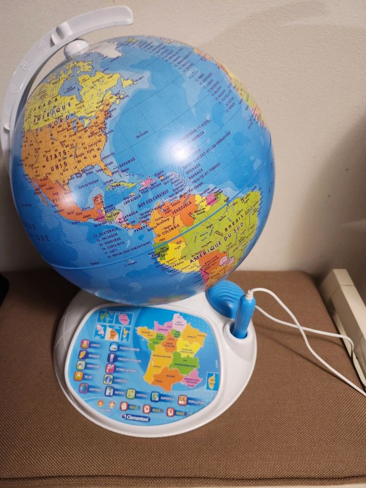 Educational globe with interactive pen. Features multiple quizzes and information. Great for kids learning geography. Includes cord. French language