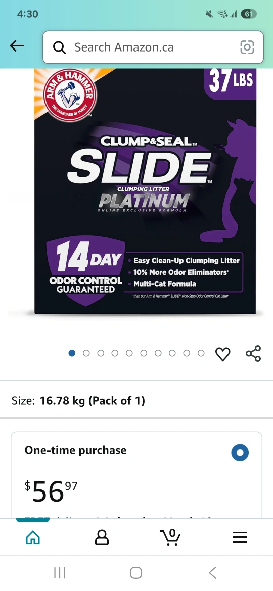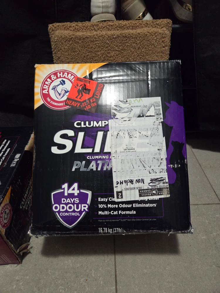 10216.78 kg box of Arm & Hammer Clump & Seal Slide Platinum clumping cat litter. Easy clean-up, odour control. Multi-cat formula. It is a special and expensive formula and thus can only be found on Amazon, not available at retail stores like Walmart Sells on Amazon for near $65 with tax Its NOT used and new in box im selling for $45 obo