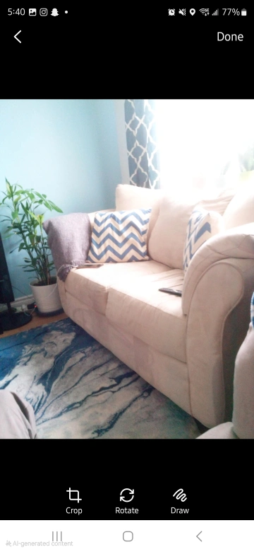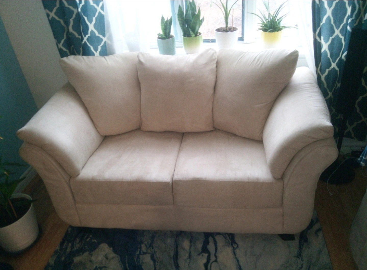 Cream coloured loveseat. Two-seater. Soft fabric. Good condition. Pick up only.