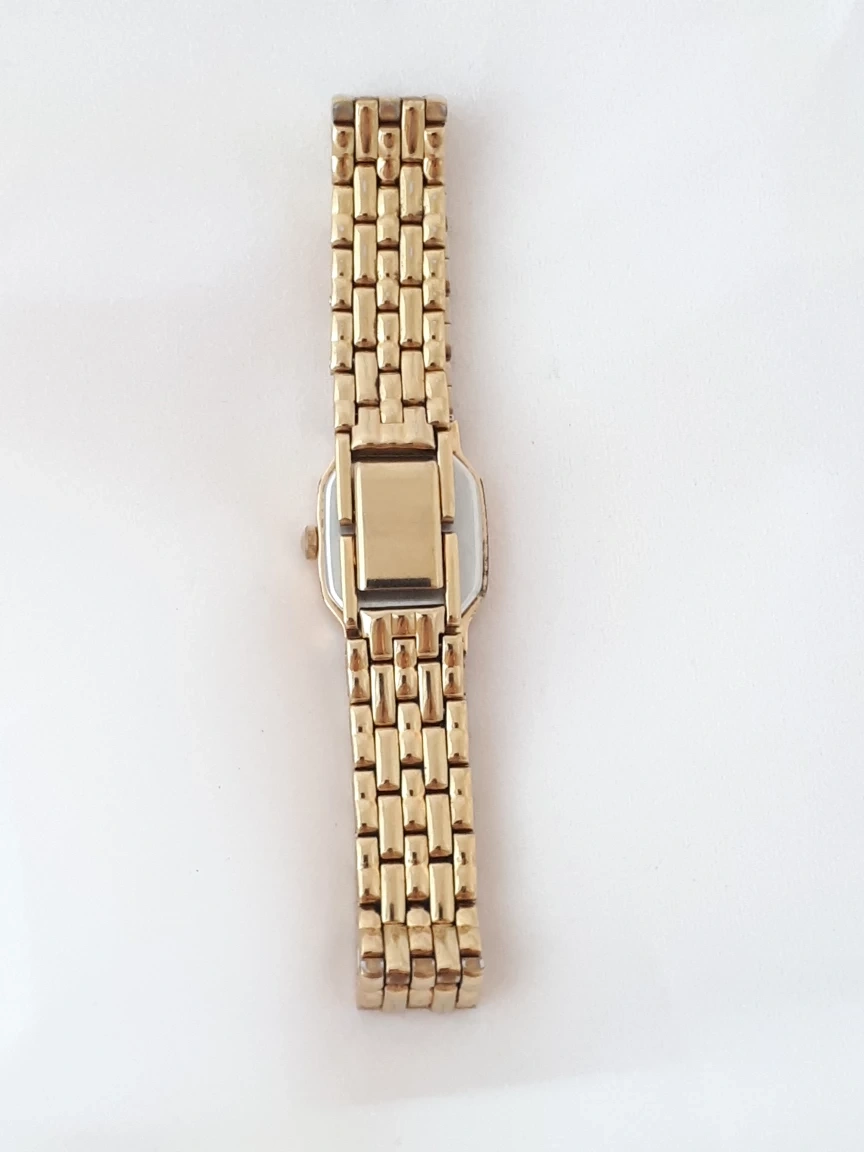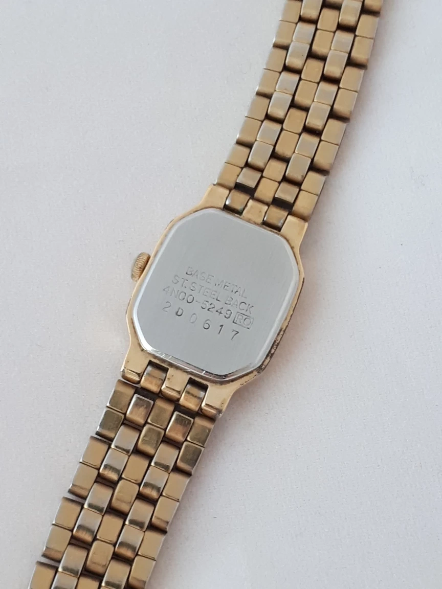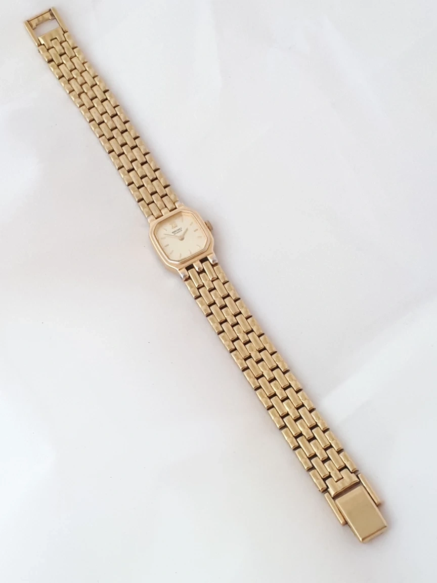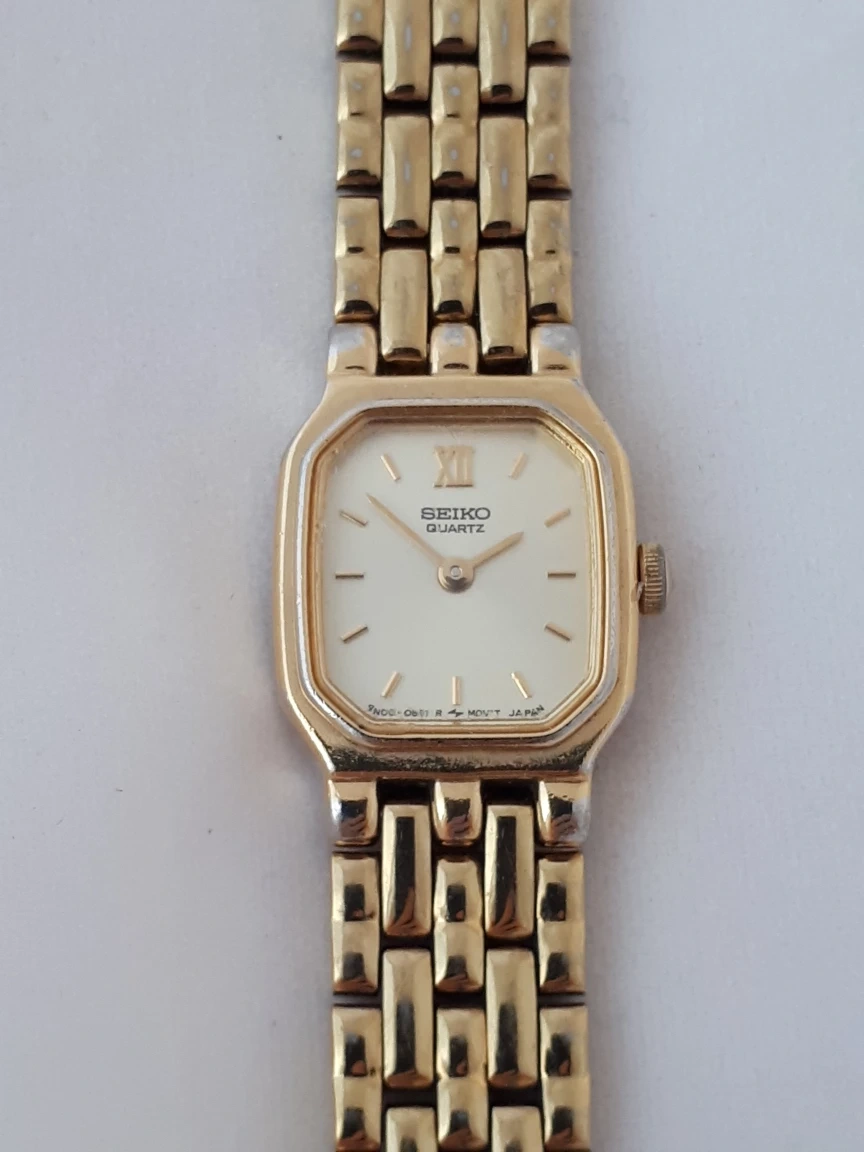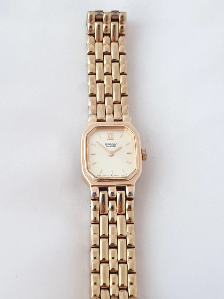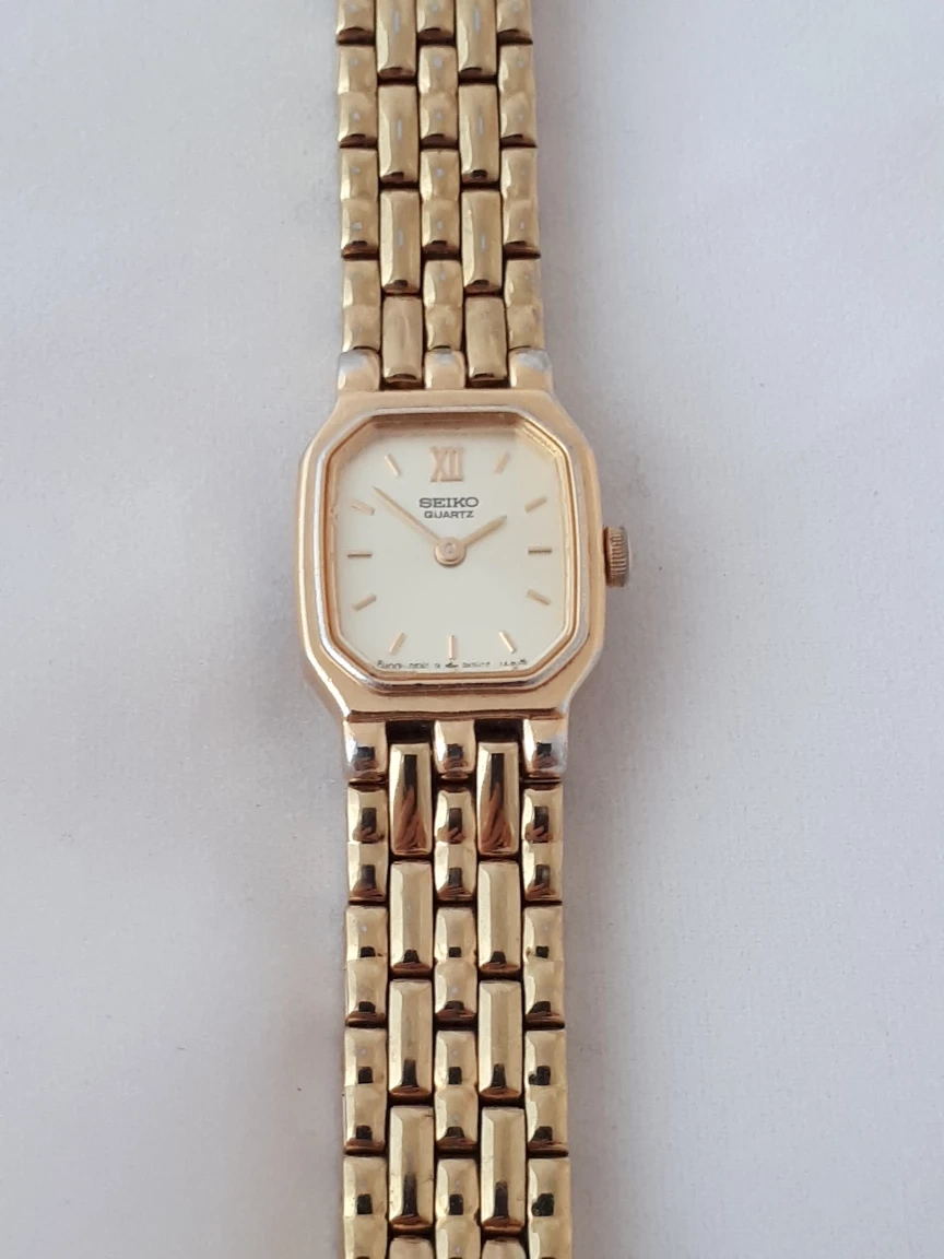 1000+This is a vintage Seiko quartz watch with a small rectangular face, integrated chain-link bracelet and elegant slim profile. Gold colour throughout. It has had only one owner. It has been worn but well cared for and is in good shape. Shows some signs of wear, mainly in the gold plating being a bit rubbed off in places -- hence the low price. It hasn't been opened in many years and it needs a new battery, but it was working fine before the battery wore out. Beyond that, I can't really say anything beyond that about its condition. π· See all 7 photos.