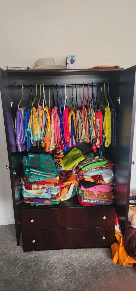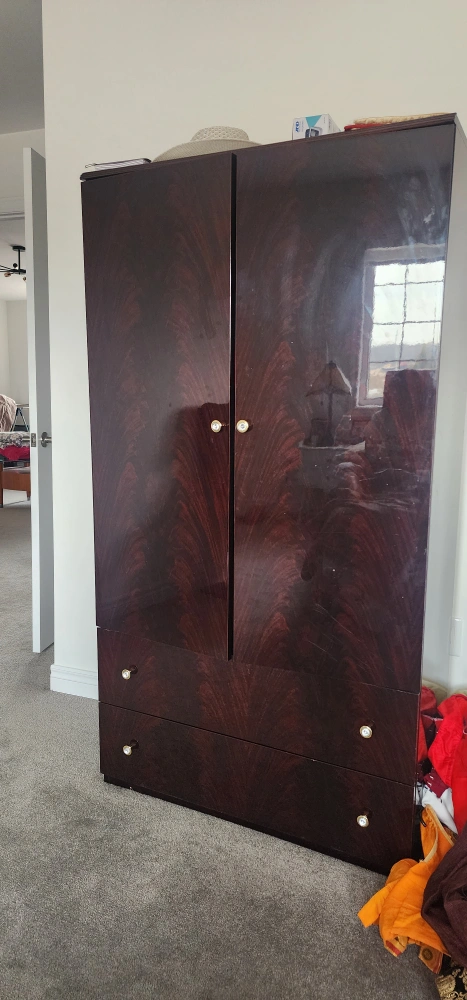 Tall dark wood armoire. Features a hanging rod and two drawers. Great for storing clothes or other items. Some minor wear and tear.