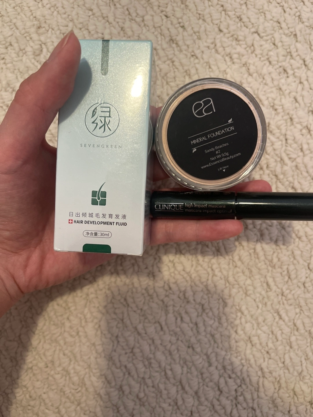 Bundle includes Clinique High Impact Mascara, Essencia Mineral Foundation, and Seven Green Hair Development Fluid.