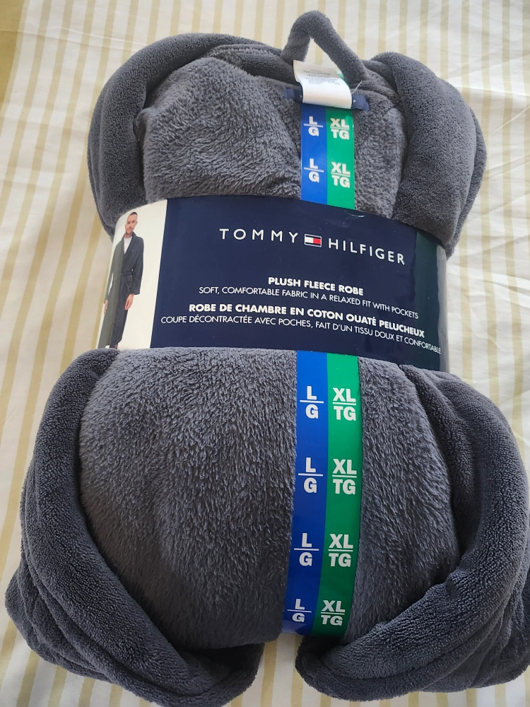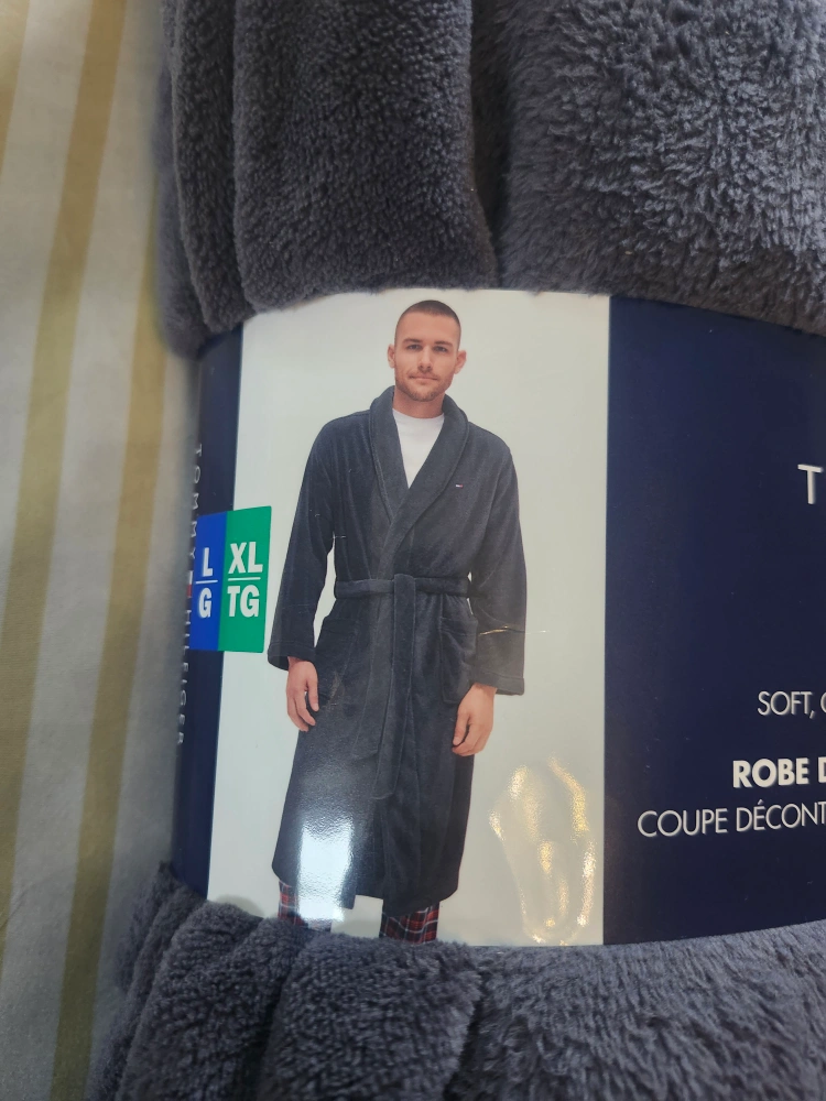 New with tags. Men's plush fleece robe. Relaxed fit. Features pockets. Soft, comfortable fabric. Charcoal grey colour.