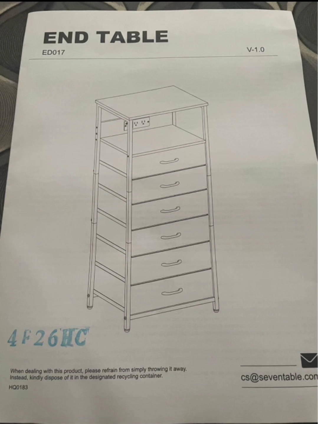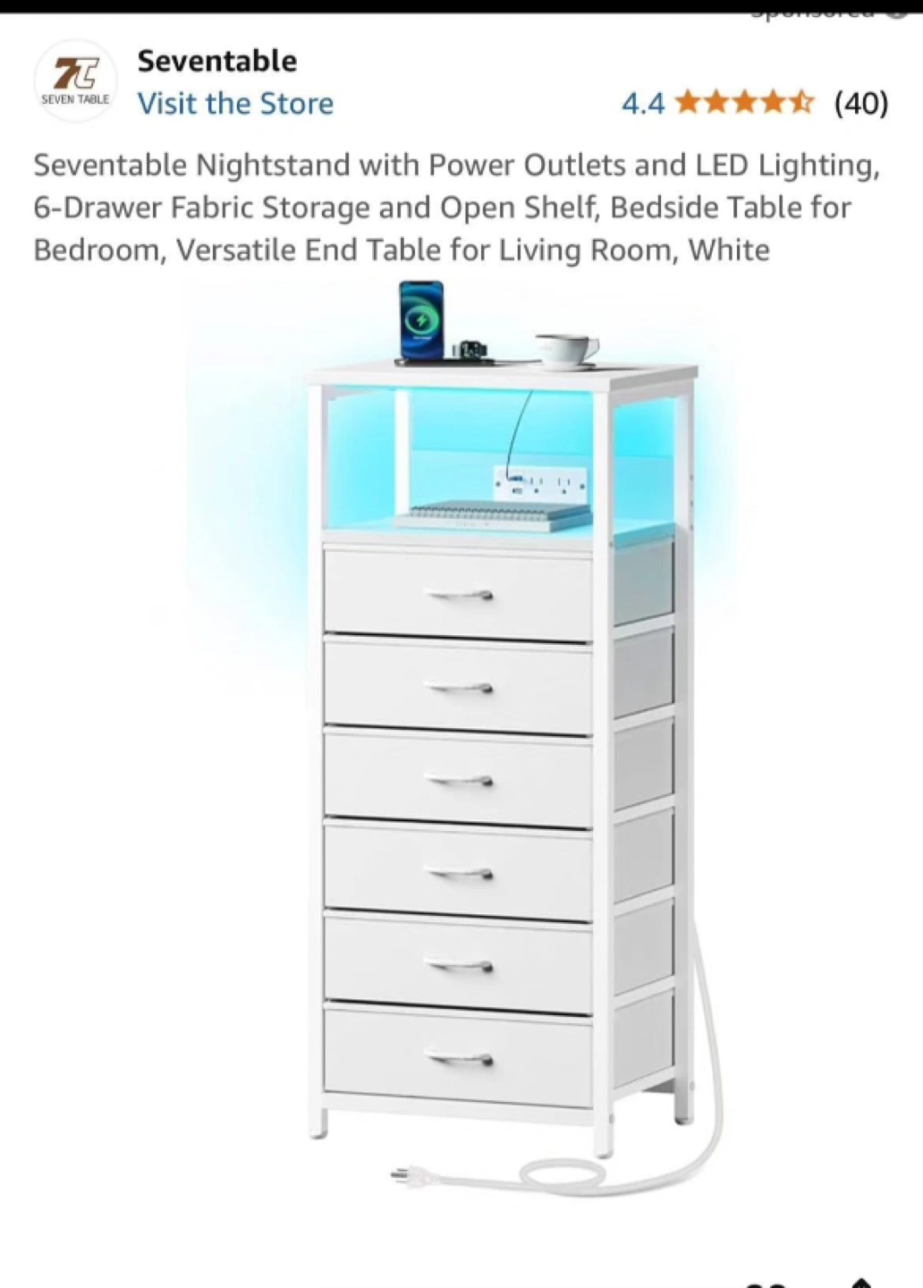 Versatile end table, great for bedroom or living room. Six drawers, open shelf, power outlets, and LED lighting. White finish, metal frame. New in box. Un-assembled.