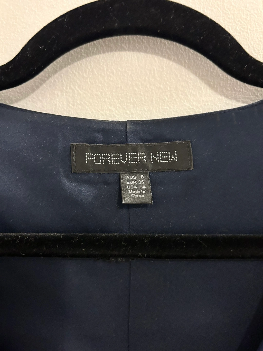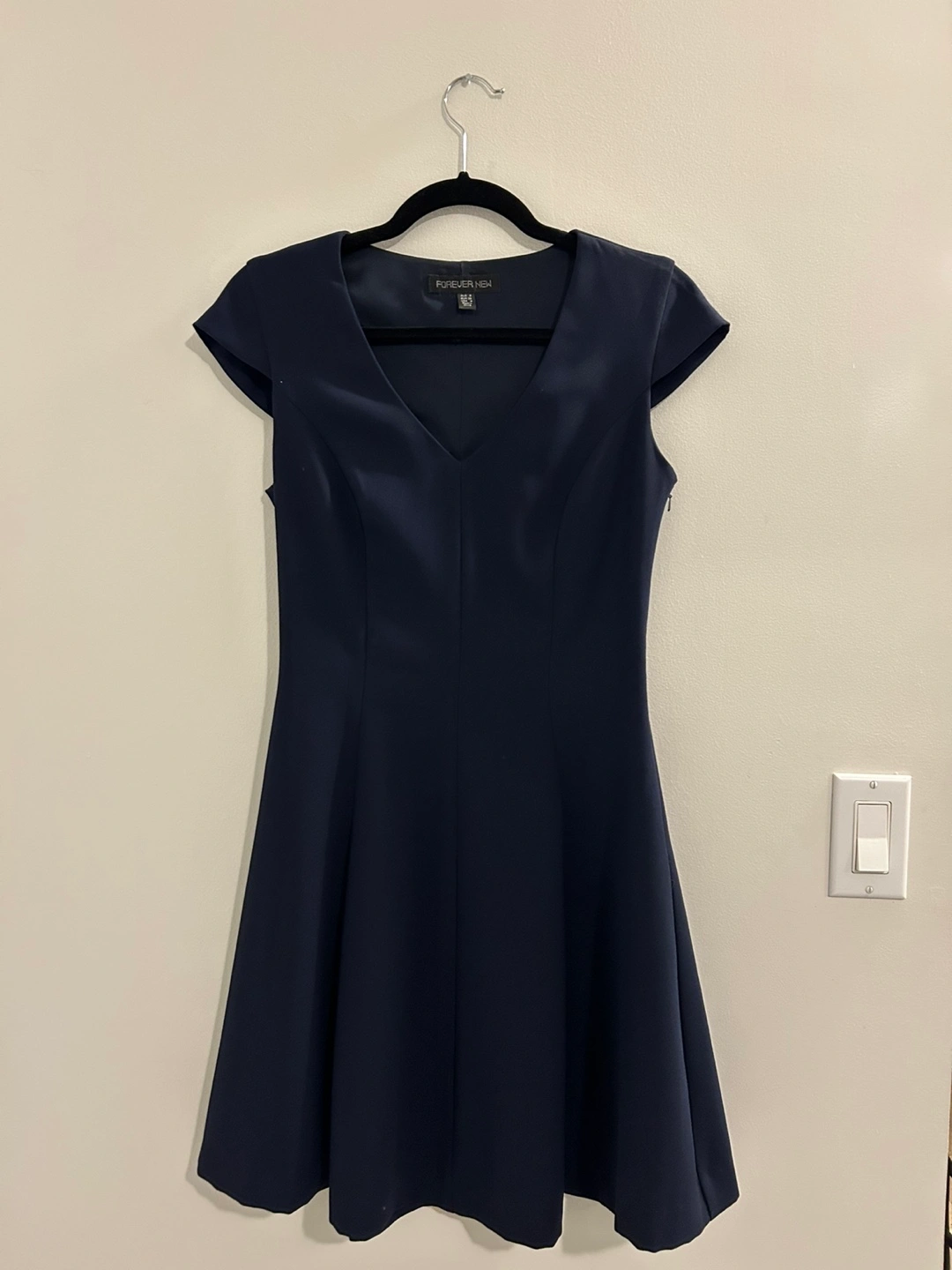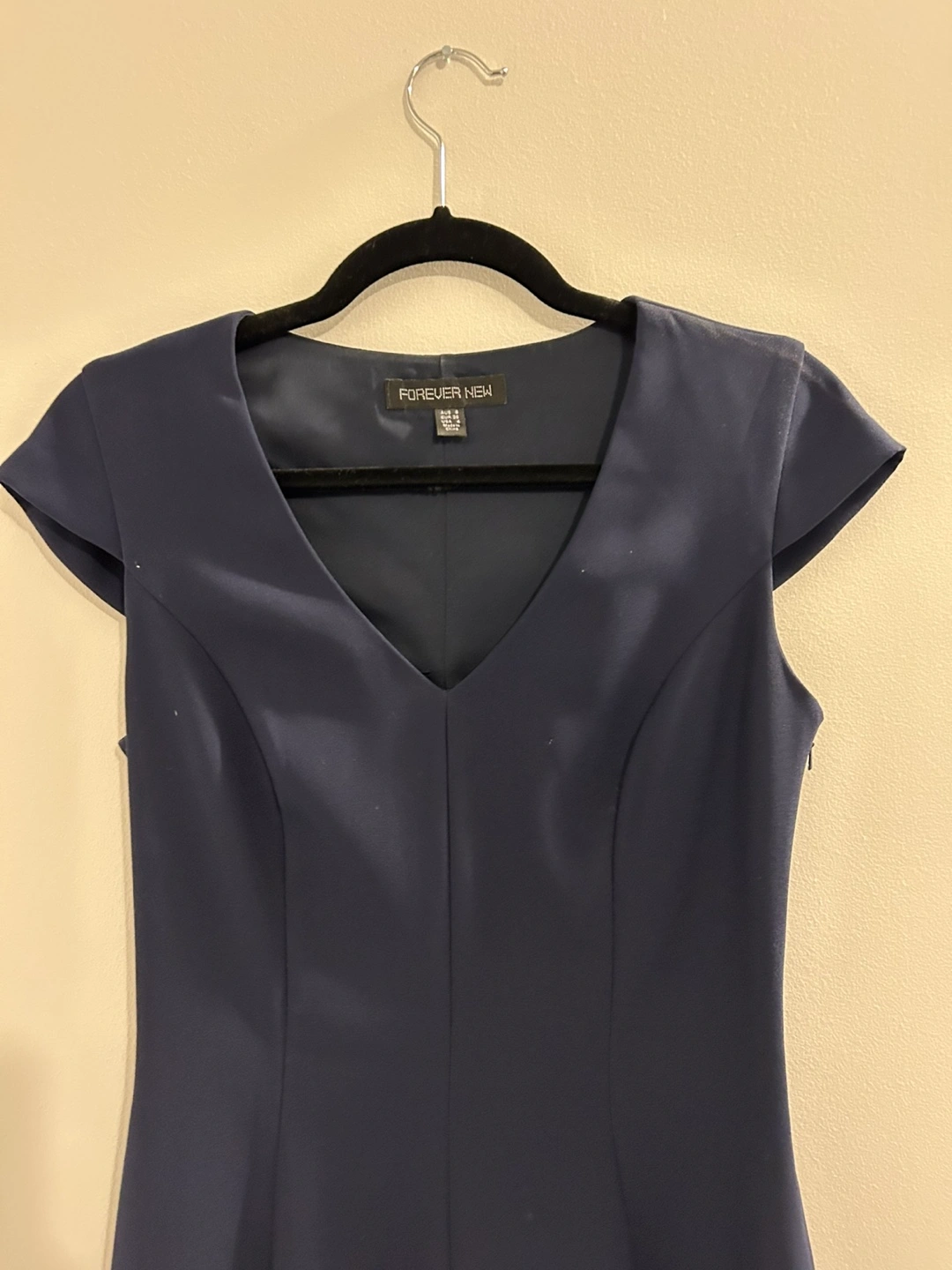 Navy blue fit and flare dress. V-neck, cap sleeves, and a flattering silhouette. Perfect for work or a night out. Size 4.
