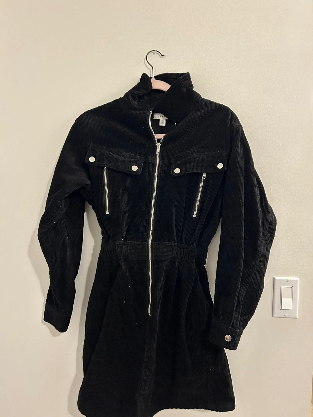 Black corduroy mini dress. Features a full zip closure, long sleeves, cinched waist, and two zippered pockets. Size 4.