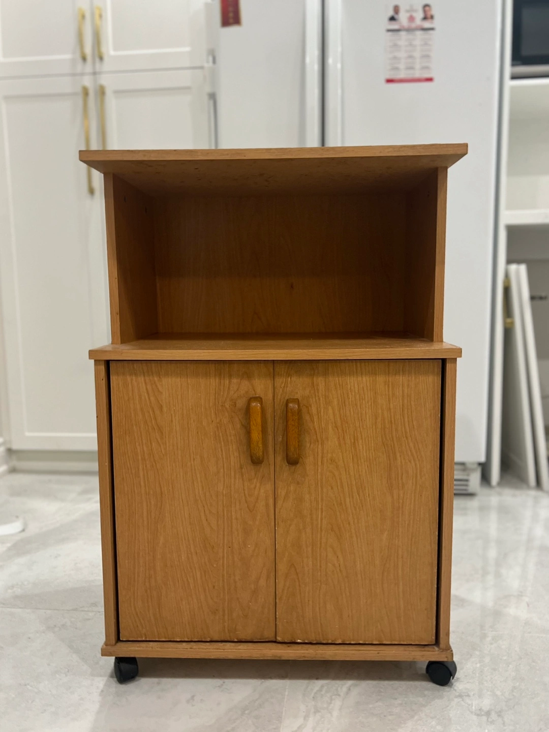 Small wooden cabinet on wheels. Features a top shelf and two doors with wooden knobs. Light brown wood finish.