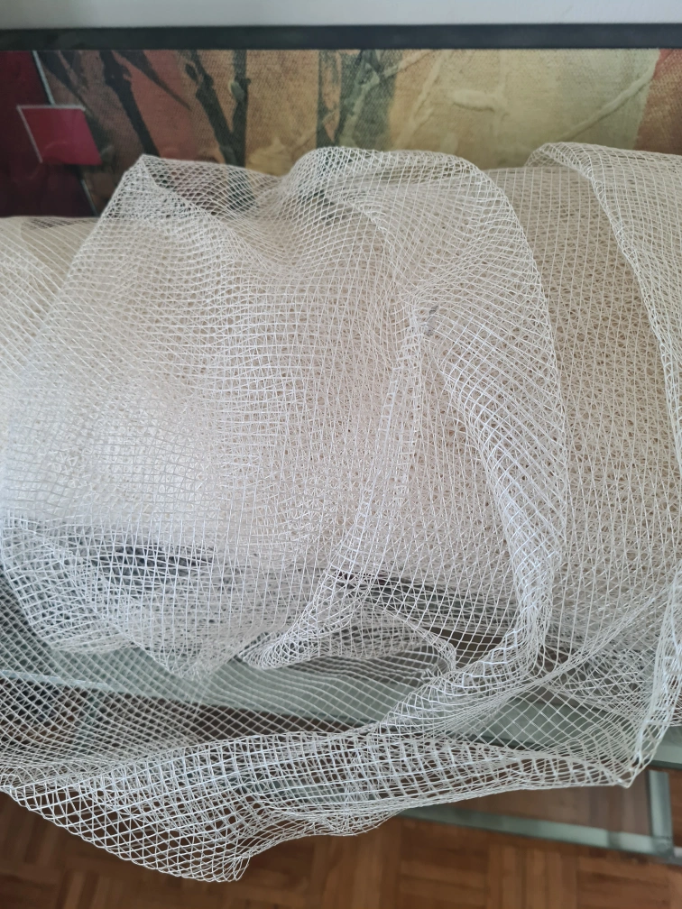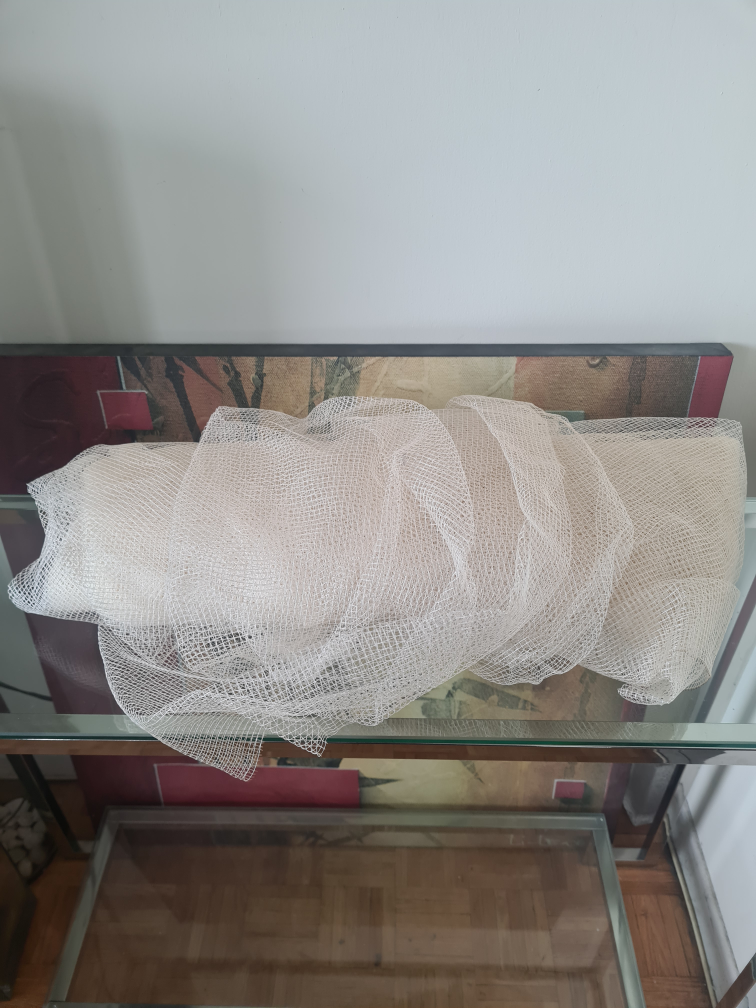 Large roll of off-white mesh fabric. Great for crafting or other projects. Unopened and unused. Approximately 1 metre wide.