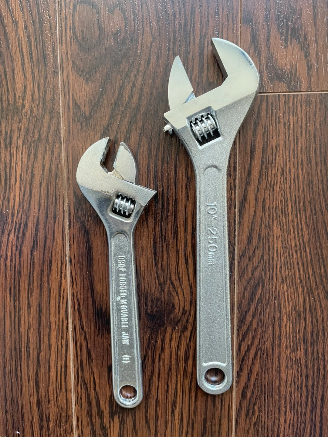 Two adjustable wrenches, one larger and one smaller. Both appear to be in good condition. Drop forged and have movable jaws.