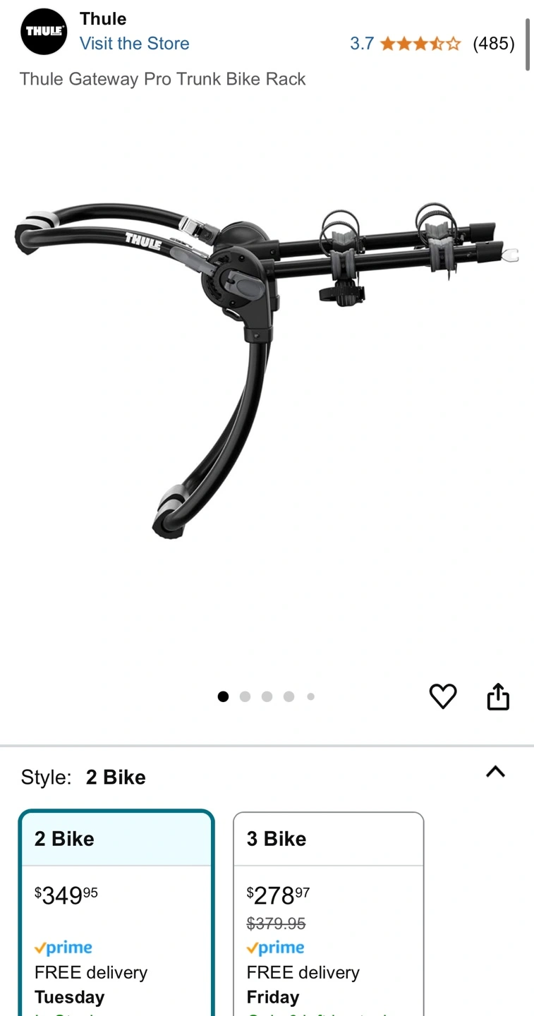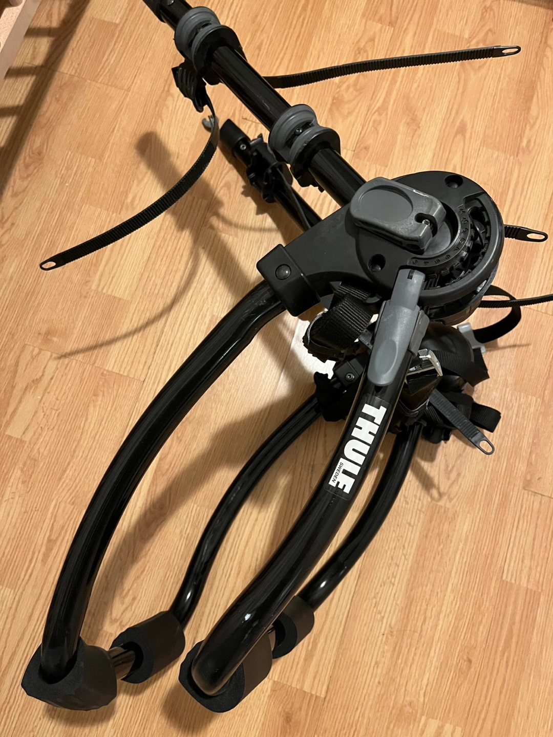 Used Thule Gateway Pro trunk bike rack. Two-bike capacity. Good condition. Includes all straps and hardware. Easy to install and use. Securely transports your bicycles.