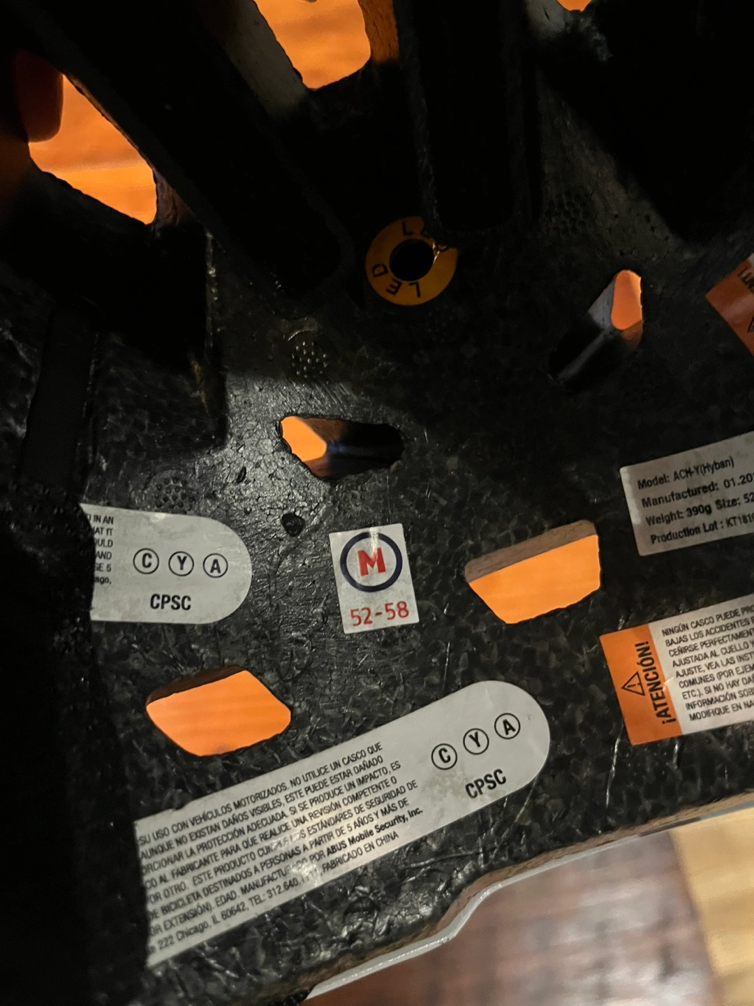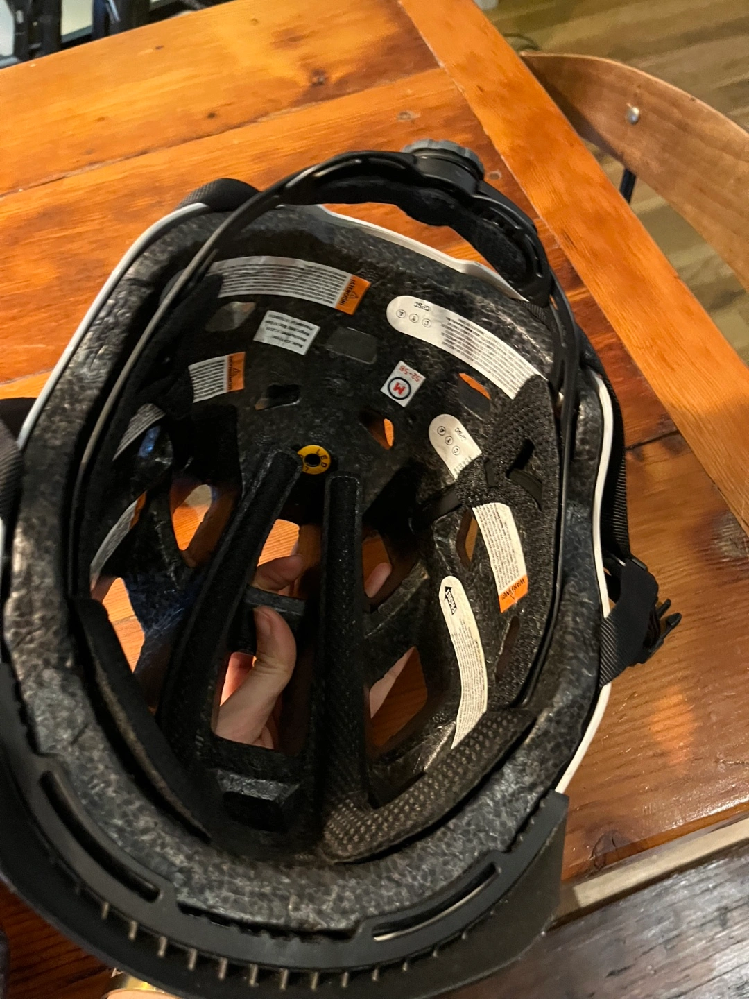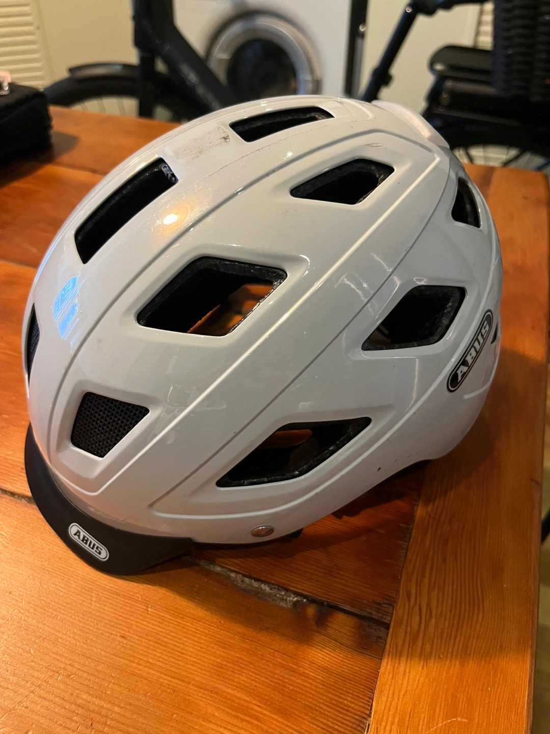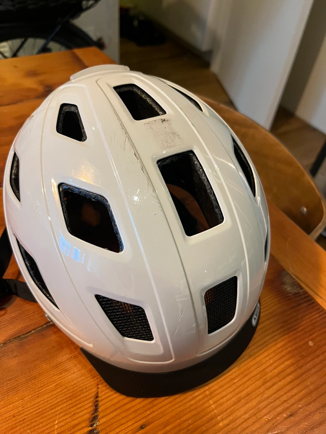 Adult bike helmet. White color. Size 52-58cm. Minor scuffs and scratches. Includes adjustable straps and visor.
