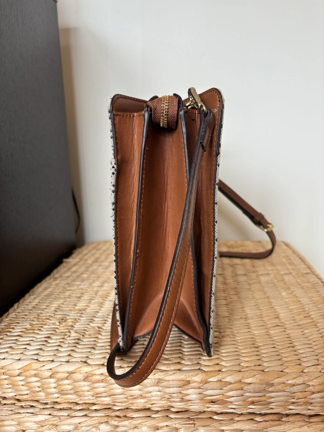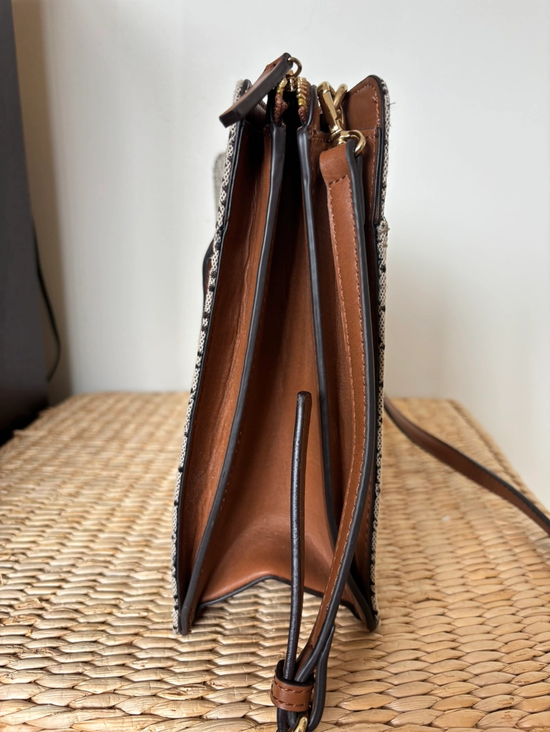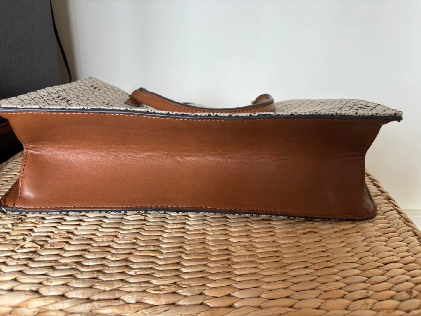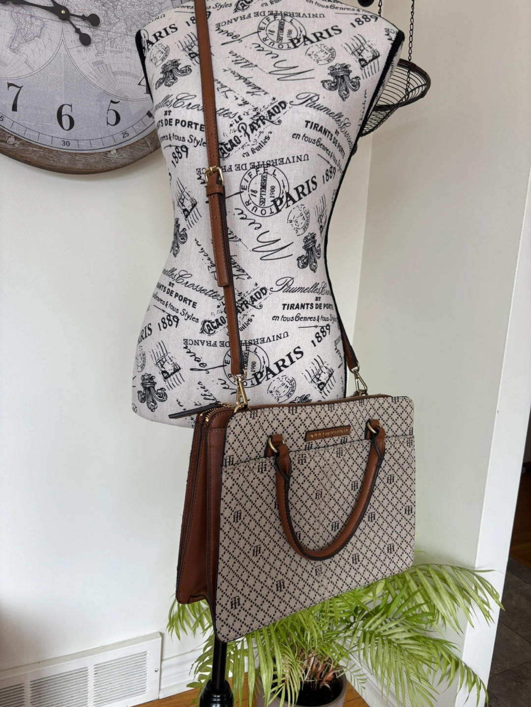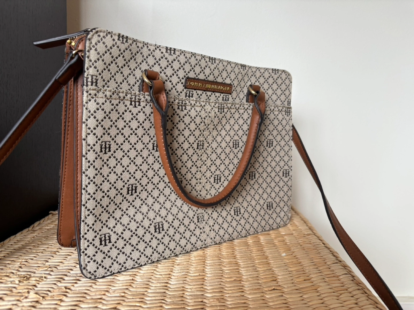 Stylish and classic style Tommy Hilfiger satchel, beige fabric with brown leather trim. Features top handles and a detachable shoulder strap. Subtle monogram pattern. Zip closure. Great for everyday use. Cash only.