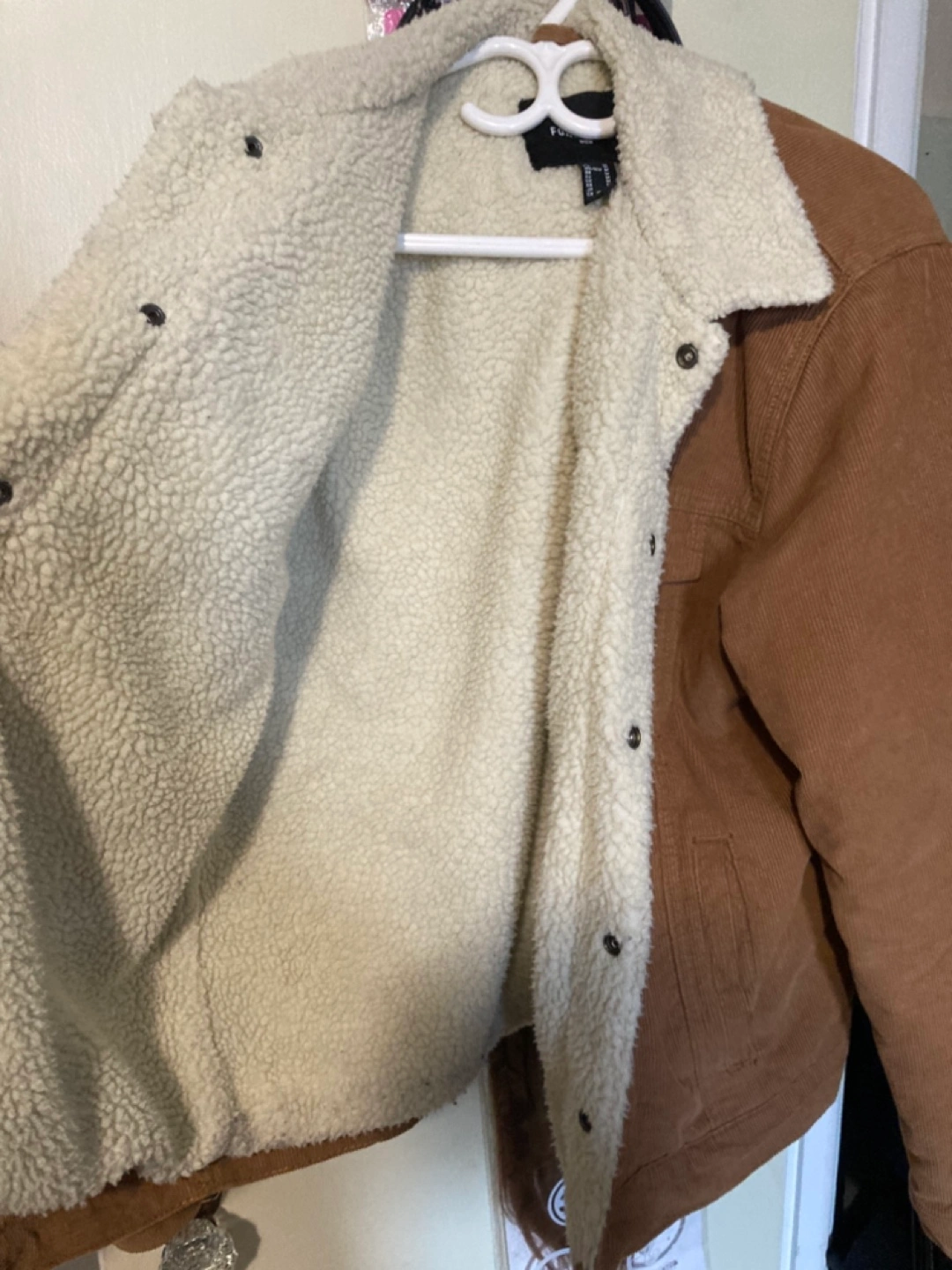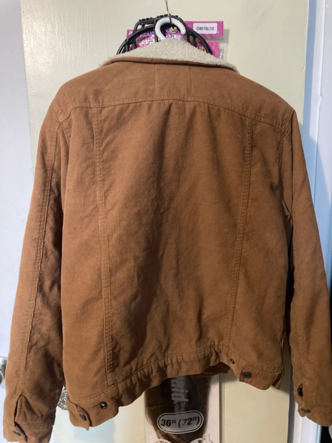 Brown corduroy jacket. Sherpa lining. Button closure. Men's size medium. Good condition.