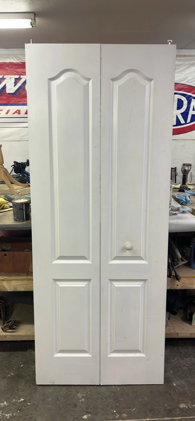 Used pair of white bi-fold closet doors. Good condition. Simple raised panel design. Includes knobs.