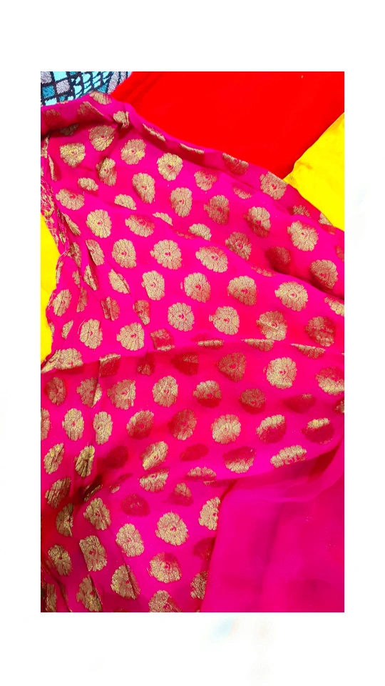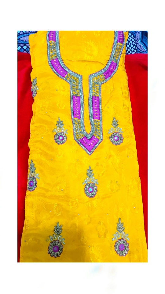 unstich suit Gorgeous three-piece Punjabi suit. Yellow embroidered top, pink bottom, and red dupatta. Intricate detailing. Suitable for special occasions.
