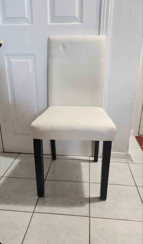 Simple design. Off-white fabric seat and back. Black wooden legs. Suitable for dining room or kitchen, from Amazon the Picture shows how they look. They both dassembled for easy transport.