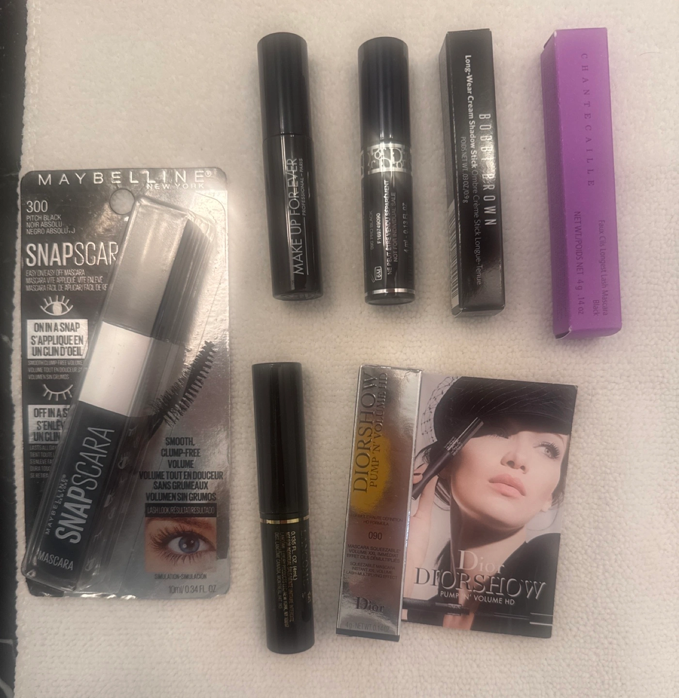 Various mascaras and an eyeshadow stick. Includes Maybelline (full size) Snapscara mascara, Make Up For Ever mascara, Dior Diorshow Pump 'n' Volume HD mascara, Bobbi Brown Long-Wear Cream Shadow Stick, and Chantecaille Faux Cils Longest Lash Mascara. Miniature sizes.