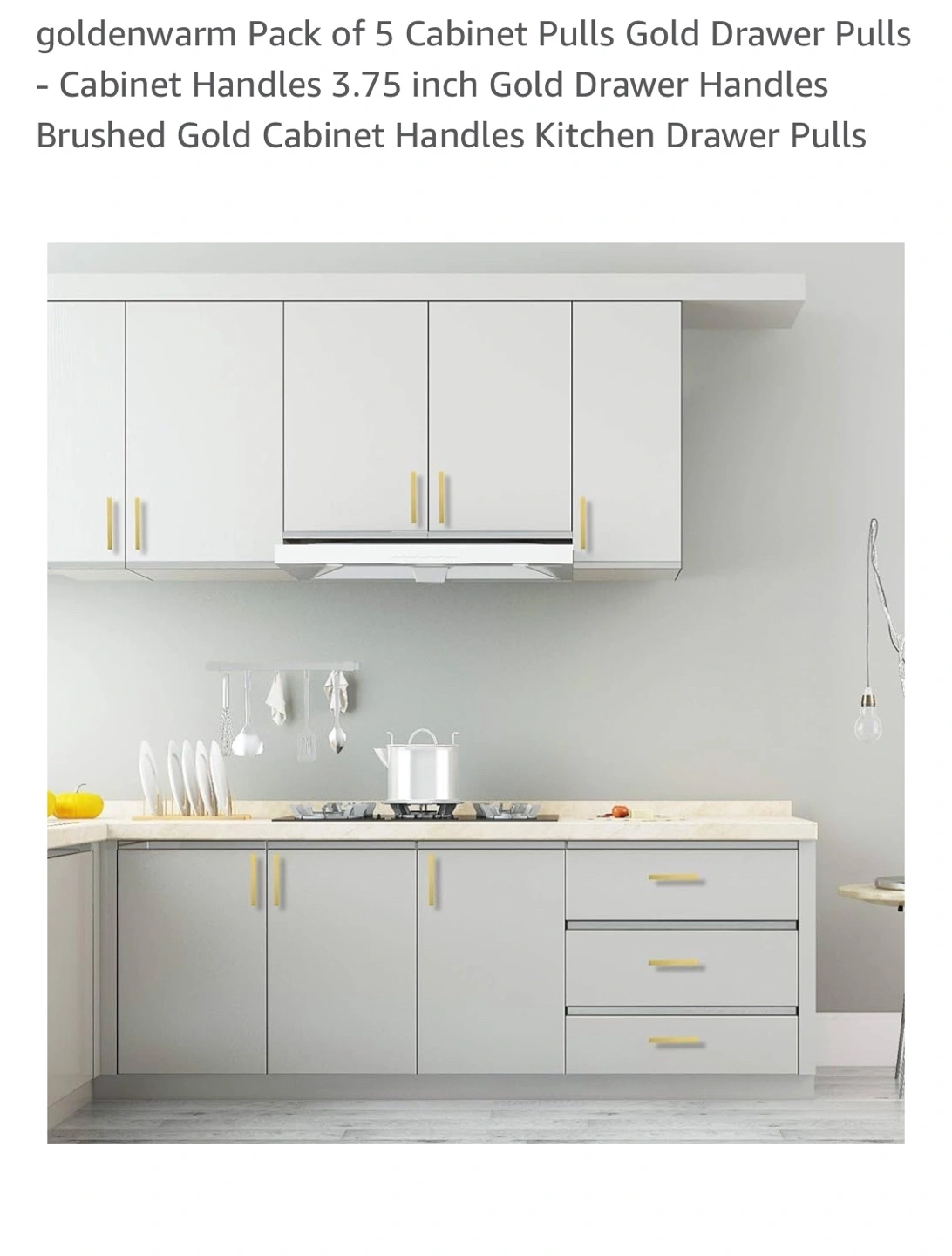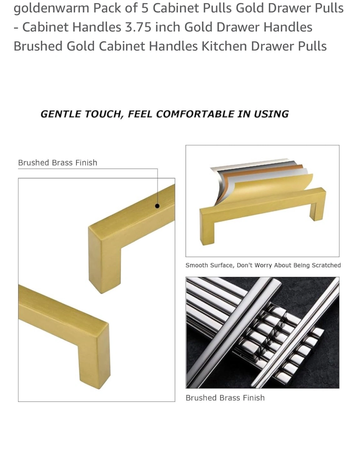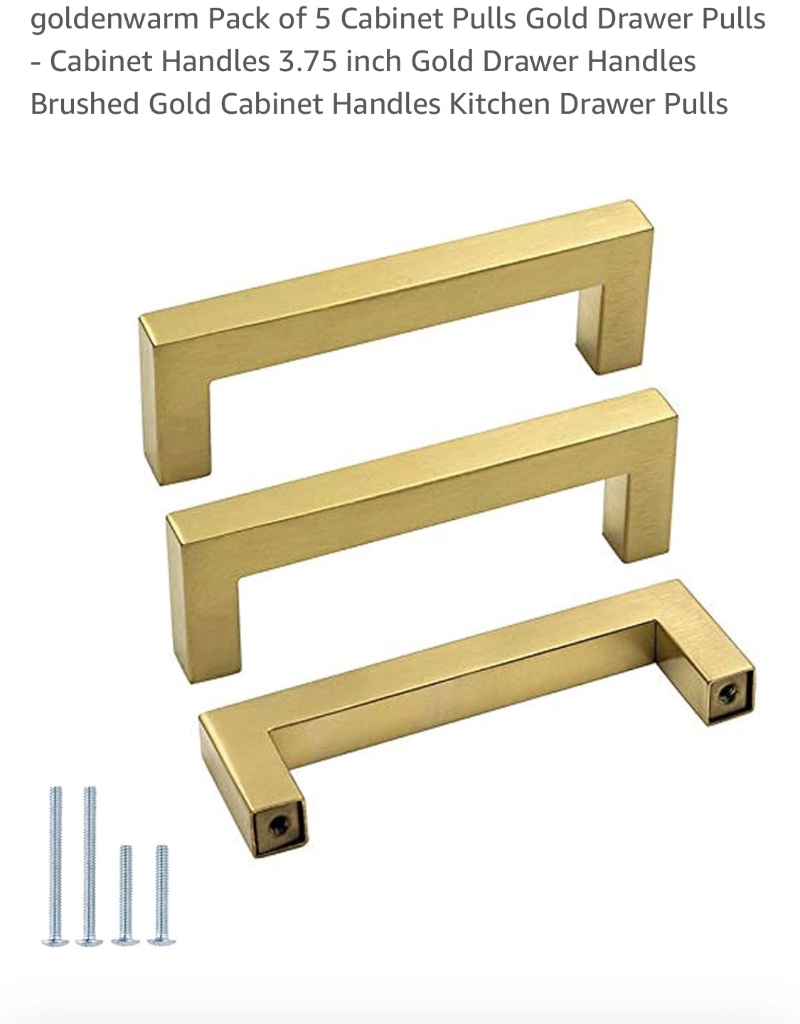 Five 3.75 inch brushed gold cabinet pulls. Includes screws. Stainless steel construction. Easy installation.10 pieces
