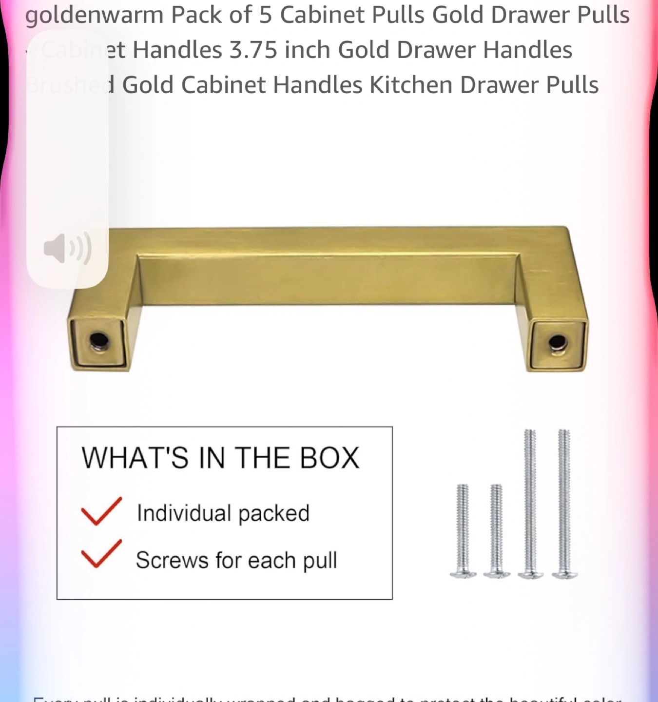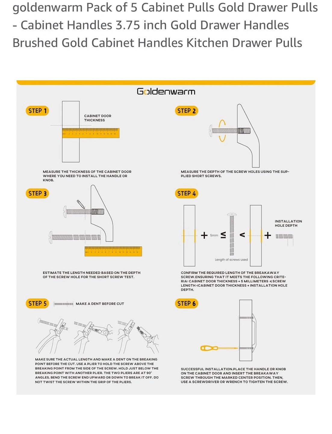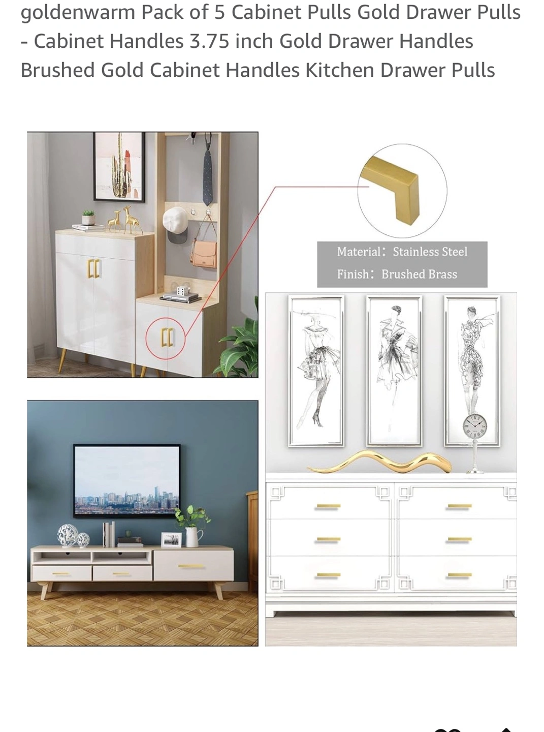 Five 3.75 inch brushed gold cabinet pulls. Includes screws. Stainless steel construction. Easy installation.10 pieces
