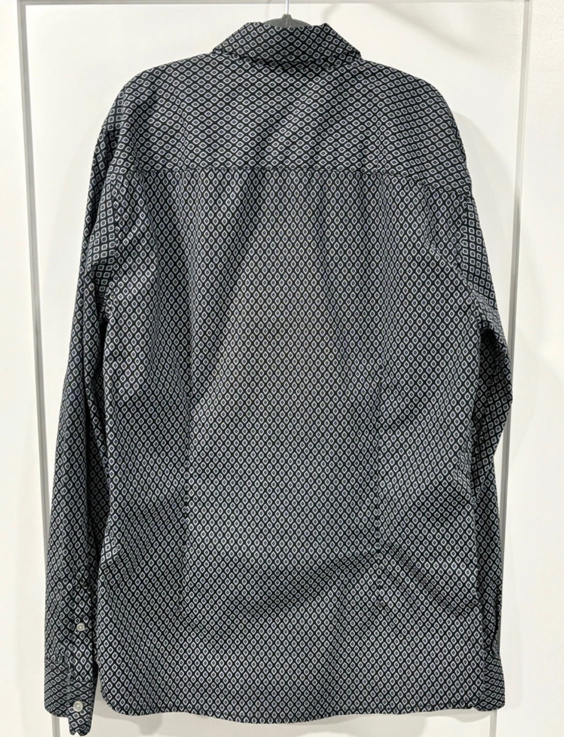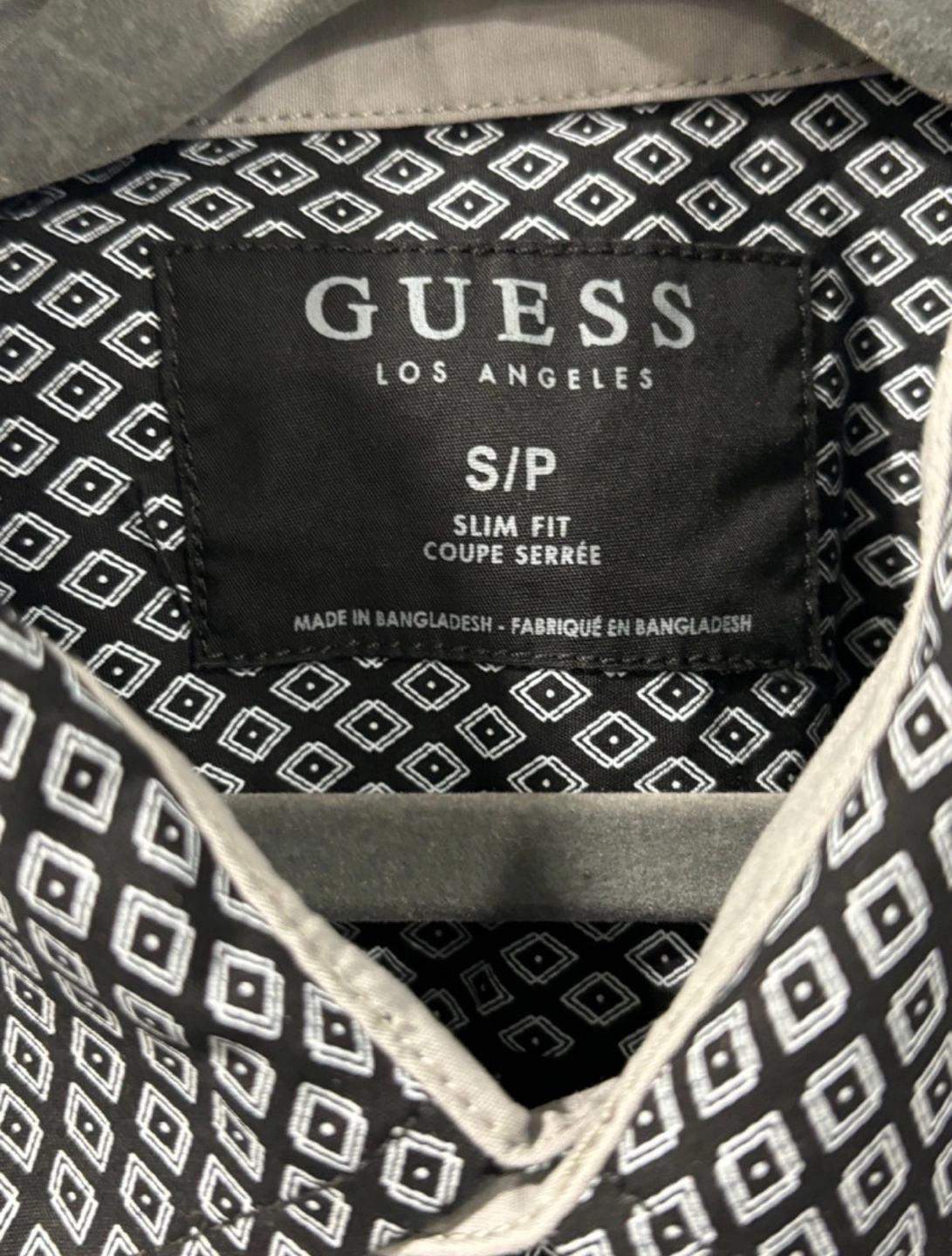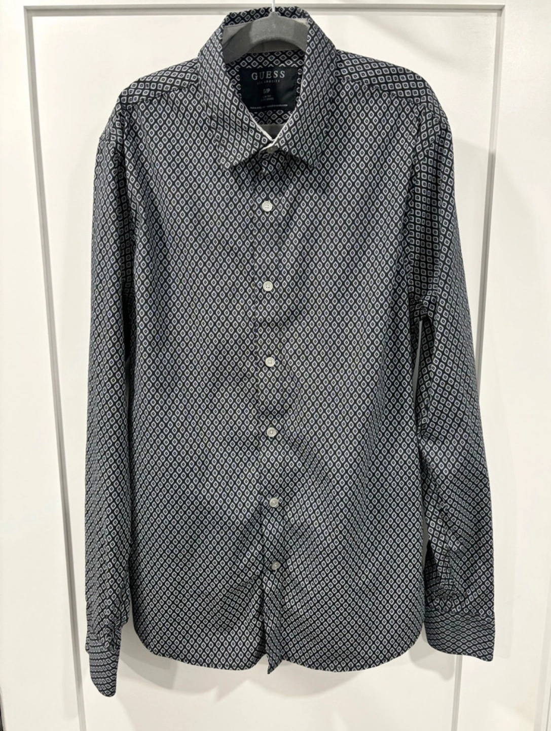 Men's Guess long sleeve button-up shirt. Slim fit. Black and grey geometric pattern. Size small.