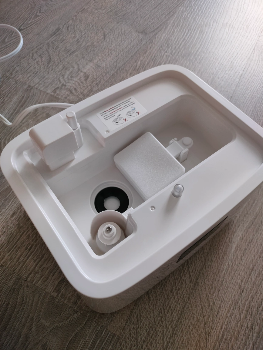 Large capacity humidifier. Quiet operation. Smart features. Used but in good condition. Includes power cord. Great for bedroom.