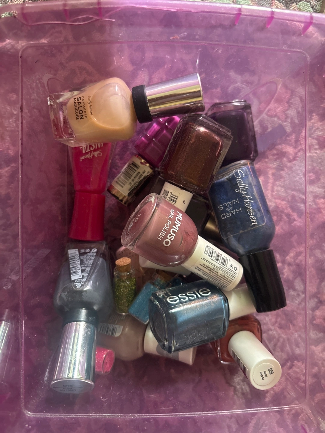 Some are new never used, some are gently used you must take all. Assorted nail polishes. Various colours and brands. Great for manicures. Includes Sally Hansen and Essie.
