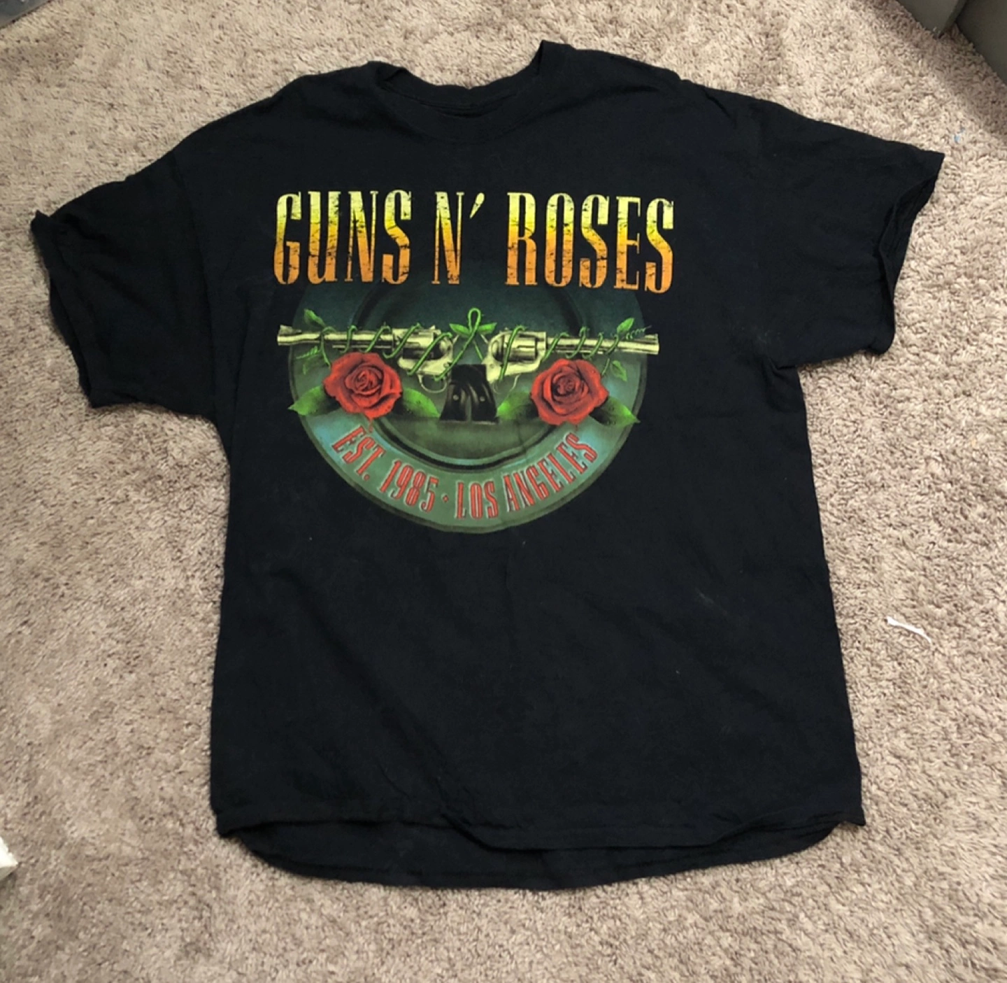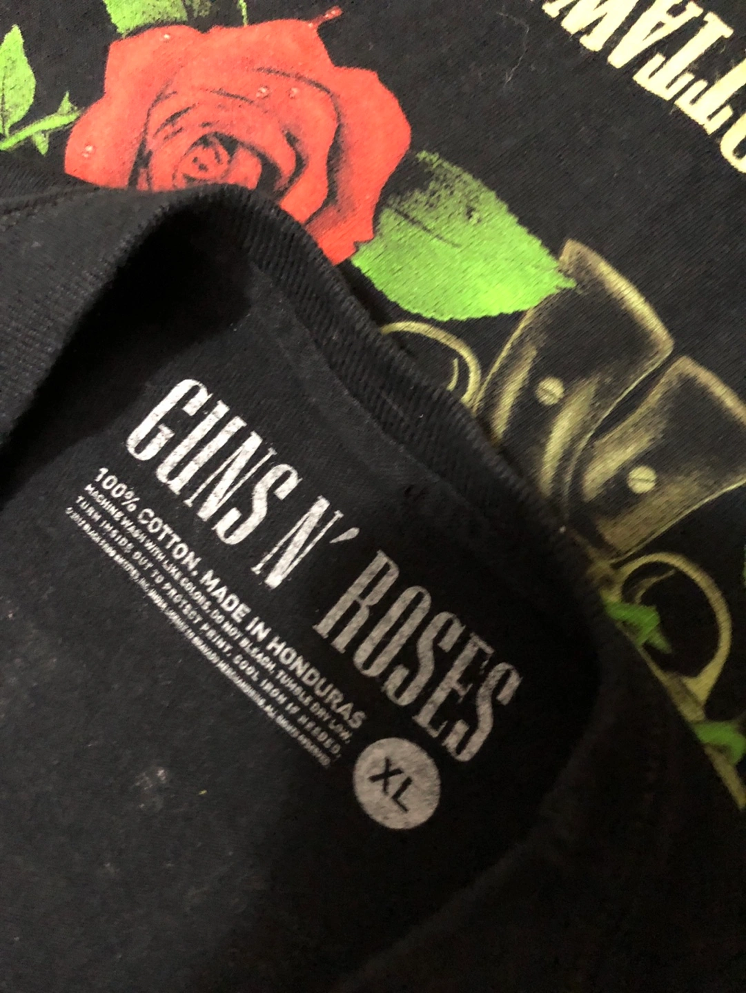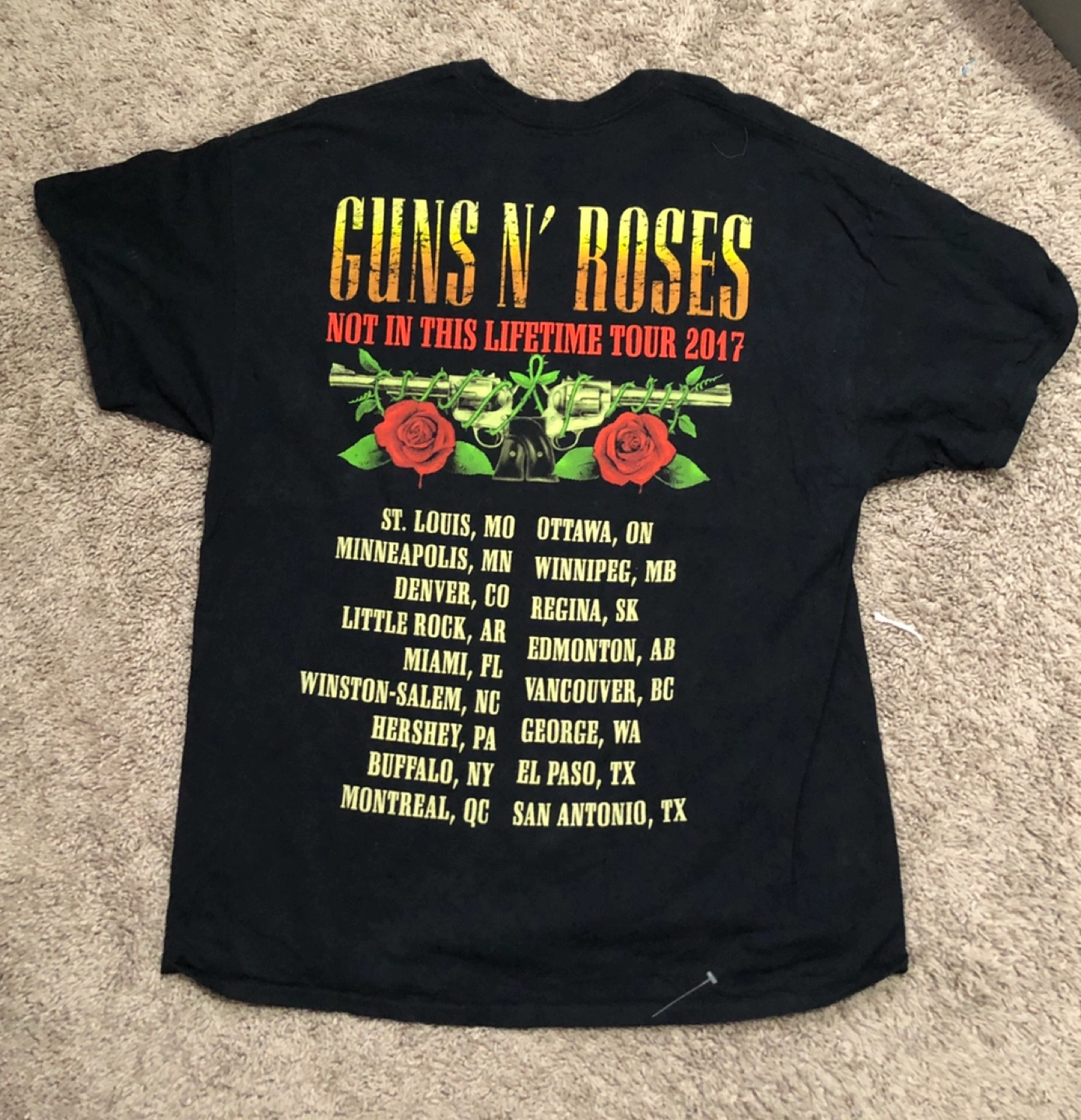 Black Guns N' Roses tour t-shirt. Features band logo and 2017 tour dates. Size XL. 100% cotton, made in Honduras.