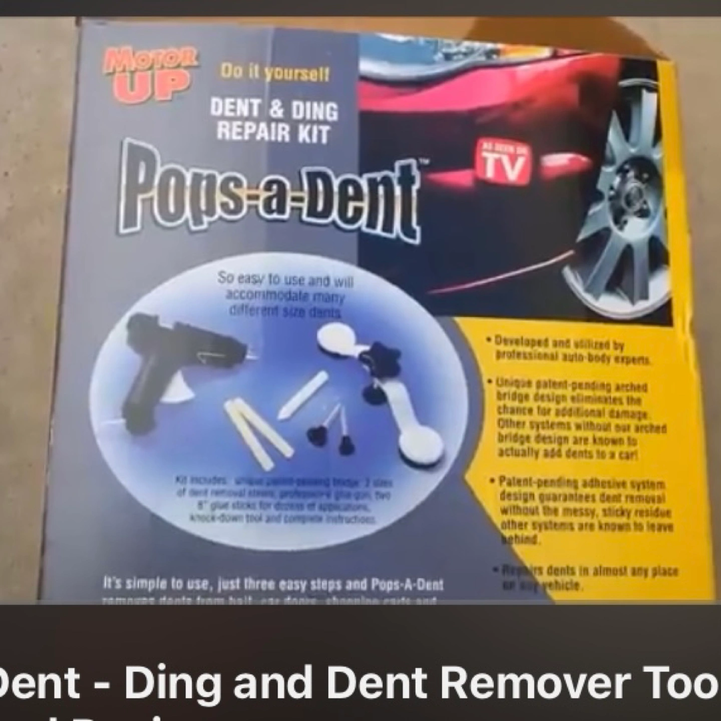 Do it yourself dent and ding repair kit. Includes glue gun, glue sticks, puller, and various sized tabs. Easy to use, three simple steps. Repair dents in almost any place on your vehicle.