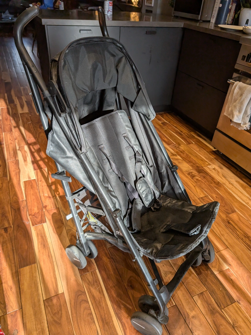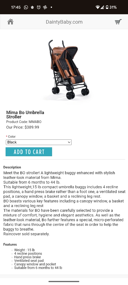 Lightweight umbrella stroller. Features 4 recline positions, a ventilated seat pad, a canopy window, a basket and a reclining leg rest. Suitable from 6 months to 44 lb. Stylish leather-look material. Boasts hygiene and elegant aesthetics.