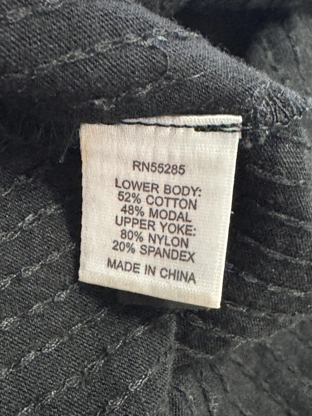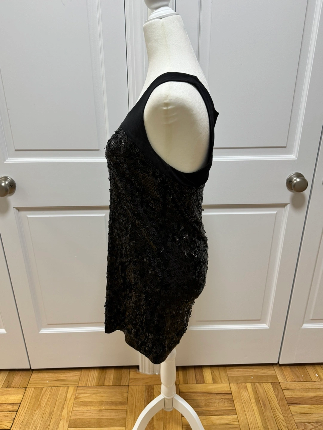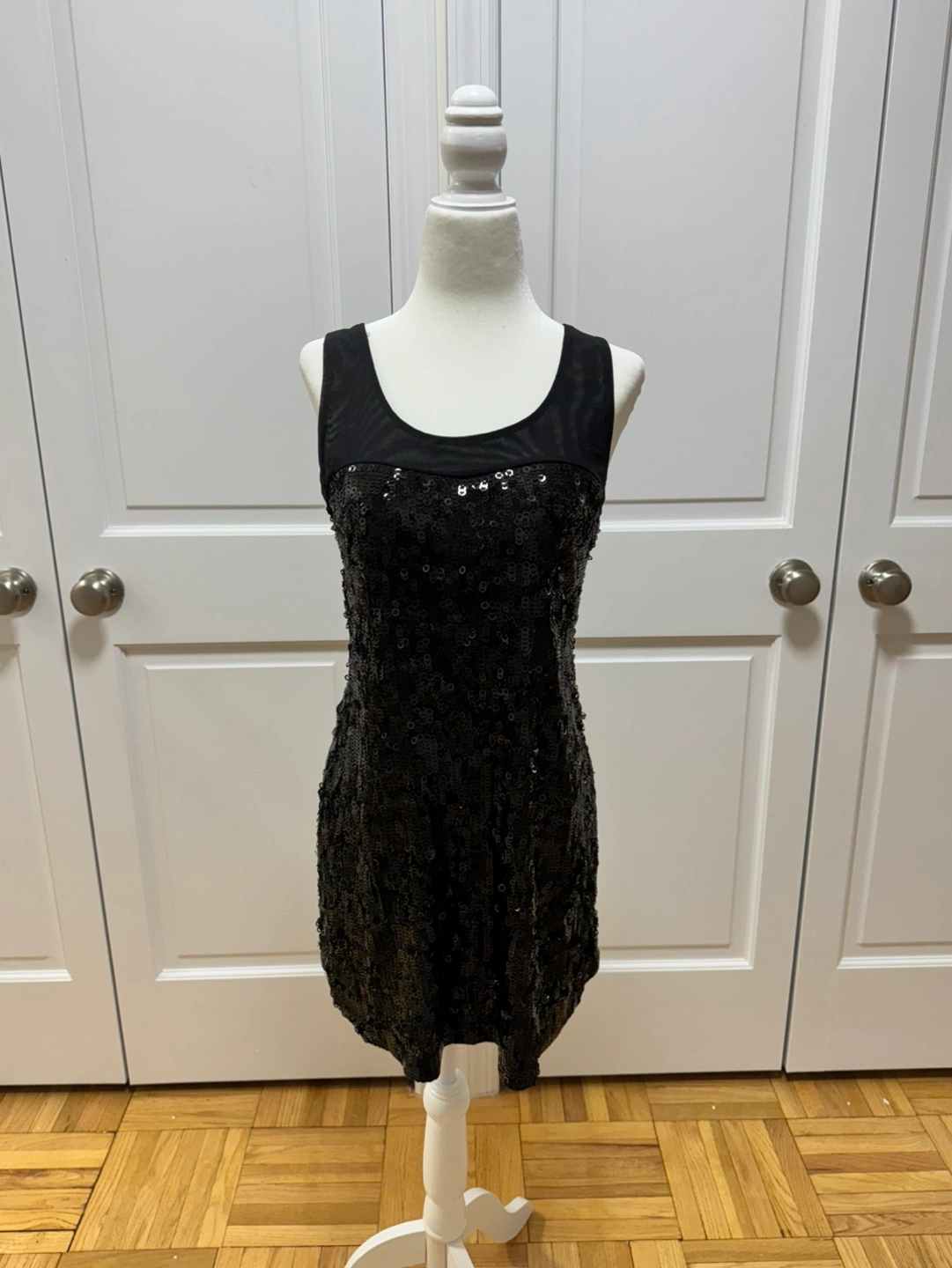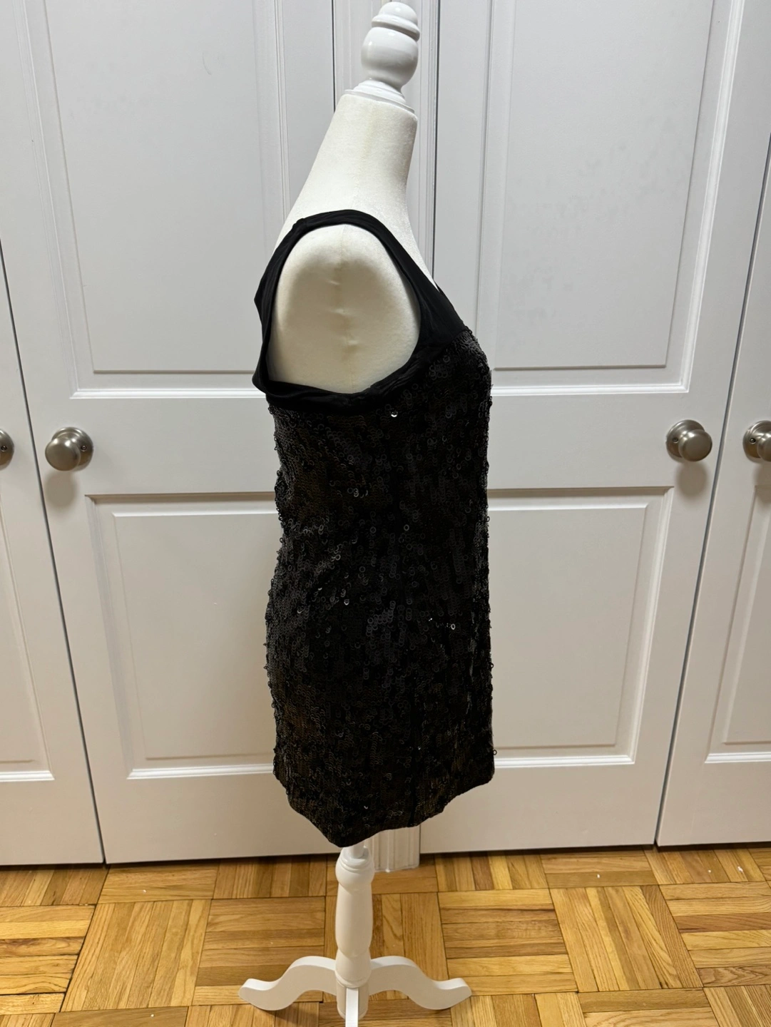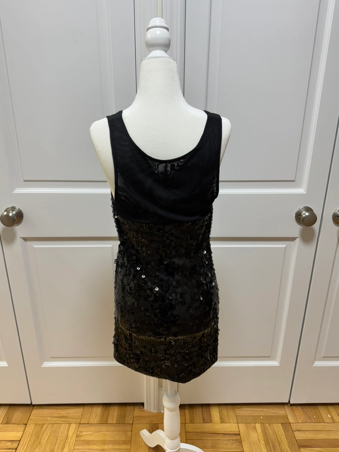 Black mini dress. Sequin bodice. Sheer yoke. Sleeveless.