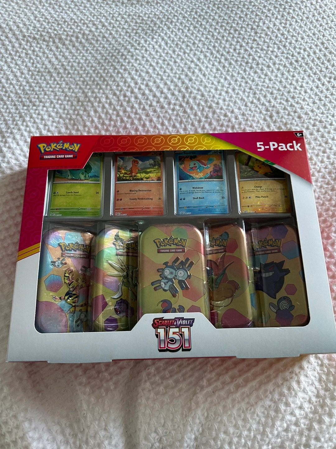 Pokemon trading card game 5-pack booster box. Includes four metal collector tins. Scarlet & Violet 151. 4 boxes available
